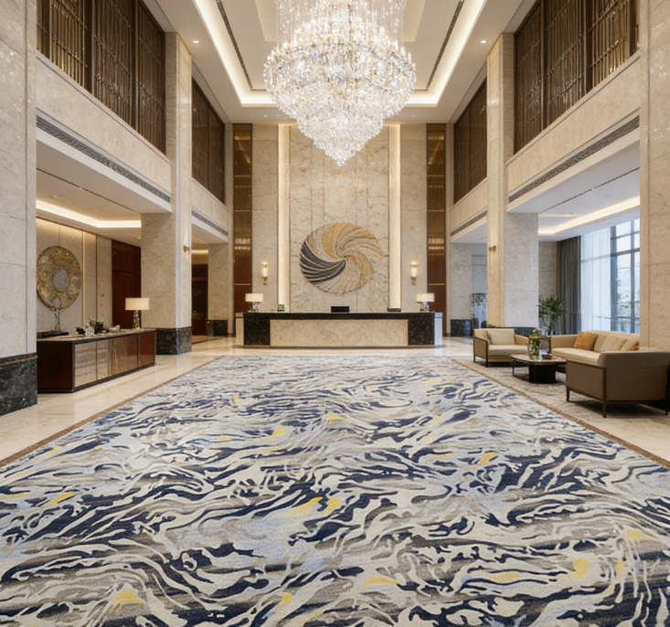 พรมโรงแรมแอ็กซ์มินสเตอร์สั่งทำพิเศษ หรูหรา ผลิตจากขนสัตว์ 80% ไนลอน 20% ผลิตด้วยเครื่องจักร ป้องกันไฟฟ้าสถิตย์ กันลื่น เหมาะสำหรับห้องจัดเลี้ยง