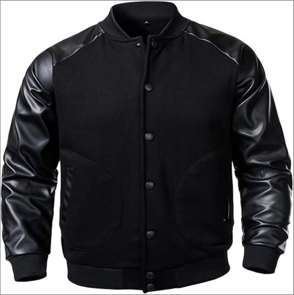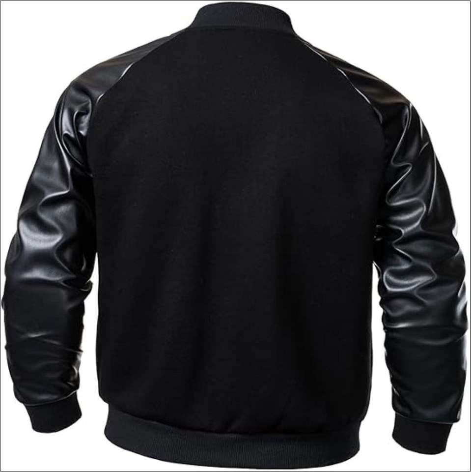 แจ็กเก็ตหนังสีดำสำหรับผู้ชายเสื้อแจ็กเก็ตทีมมหาวิทยาลัยแบบปักลายแขนเสื้อสวมด้านบนพอดีตัวเสื้อแจ็คเก็ตสำหรับผู้ชาย