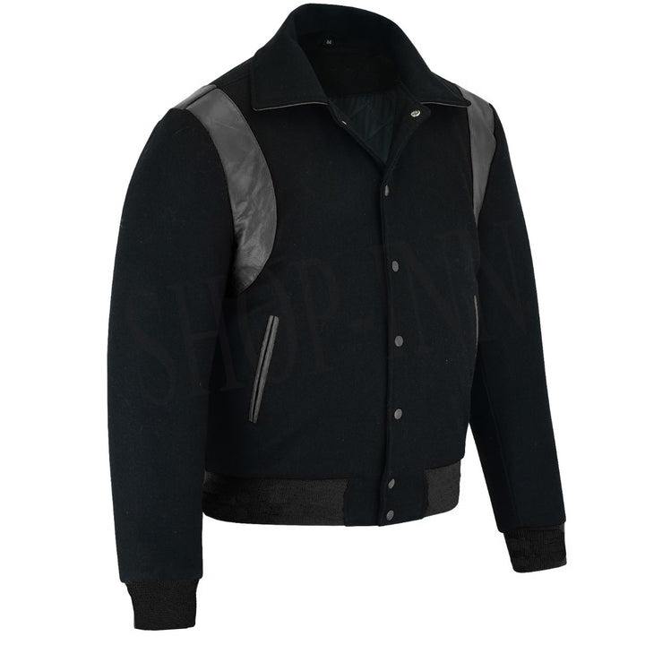 แจ็กเก็ตเบสบอลสีดำสำหรับผู้ชายเสื้อแจ็กเก็ตเบสบอลแขนหนังตัวอักษรสำหรับผู้ชาย