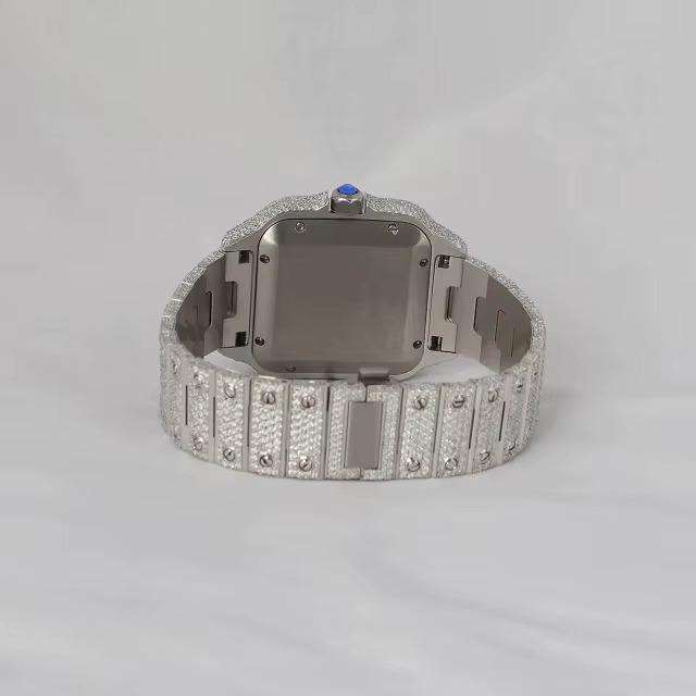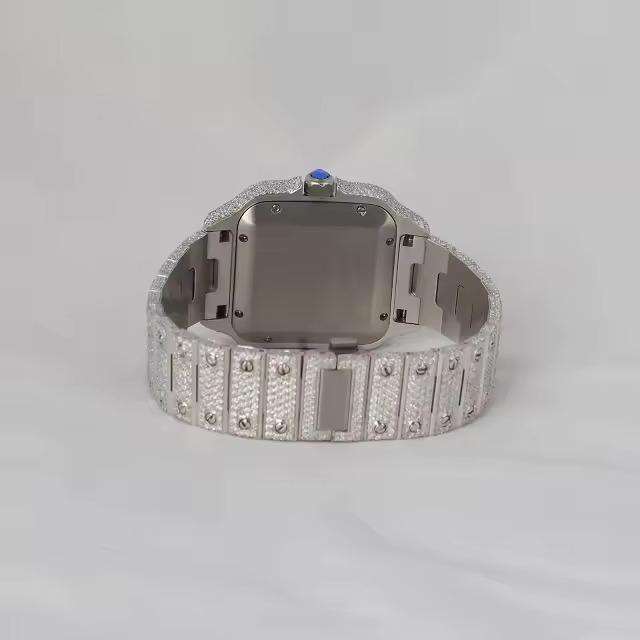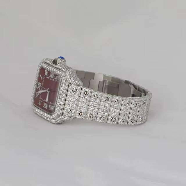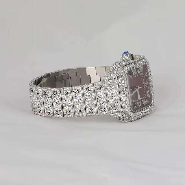 นาฬิกาข้อมือผู้ชายทรงสี่เหลี่ยมหน้าปัดแดงโรมัน ตัวเรือนสแตนเลสสตีลหรูหราประดับเพชรทรงกลมและมอสซาไนต์เต็มหน้าปัดสีเงิน