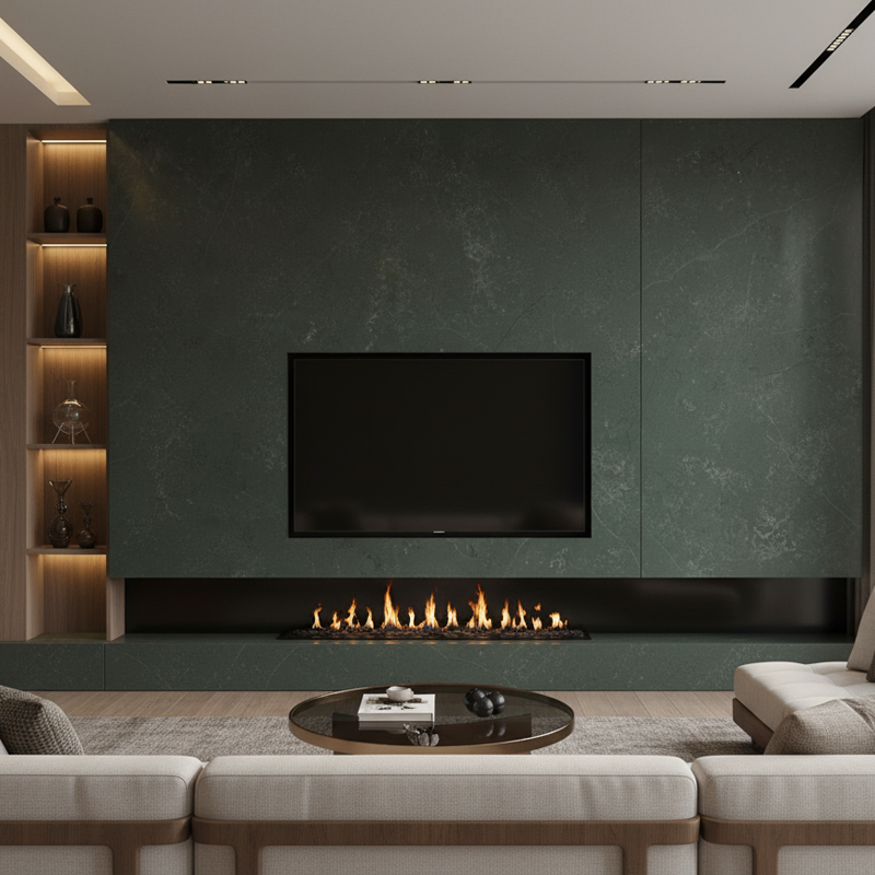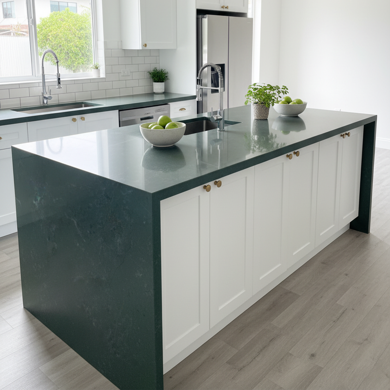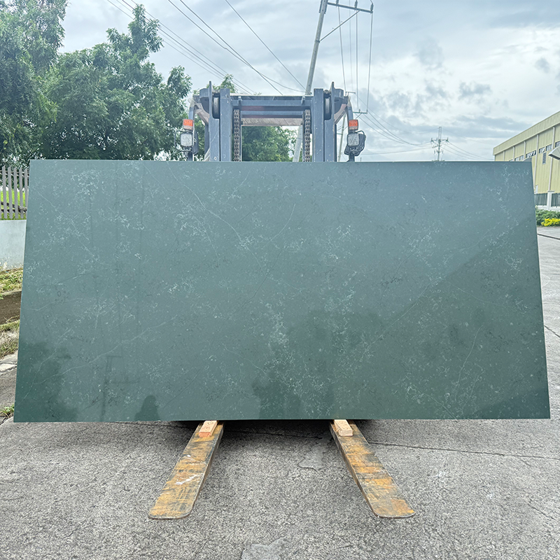 เคาน์เตอร์เคาน์เตอร์หินควอทซ์เทียมสำหรับห้องครัวแผ่นควอทซ์ขัดมรกตหรูหราออกแบบได้ตามต้องการ