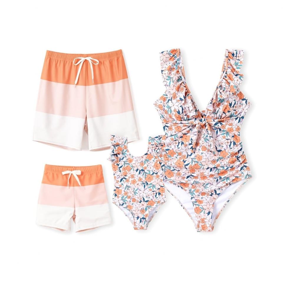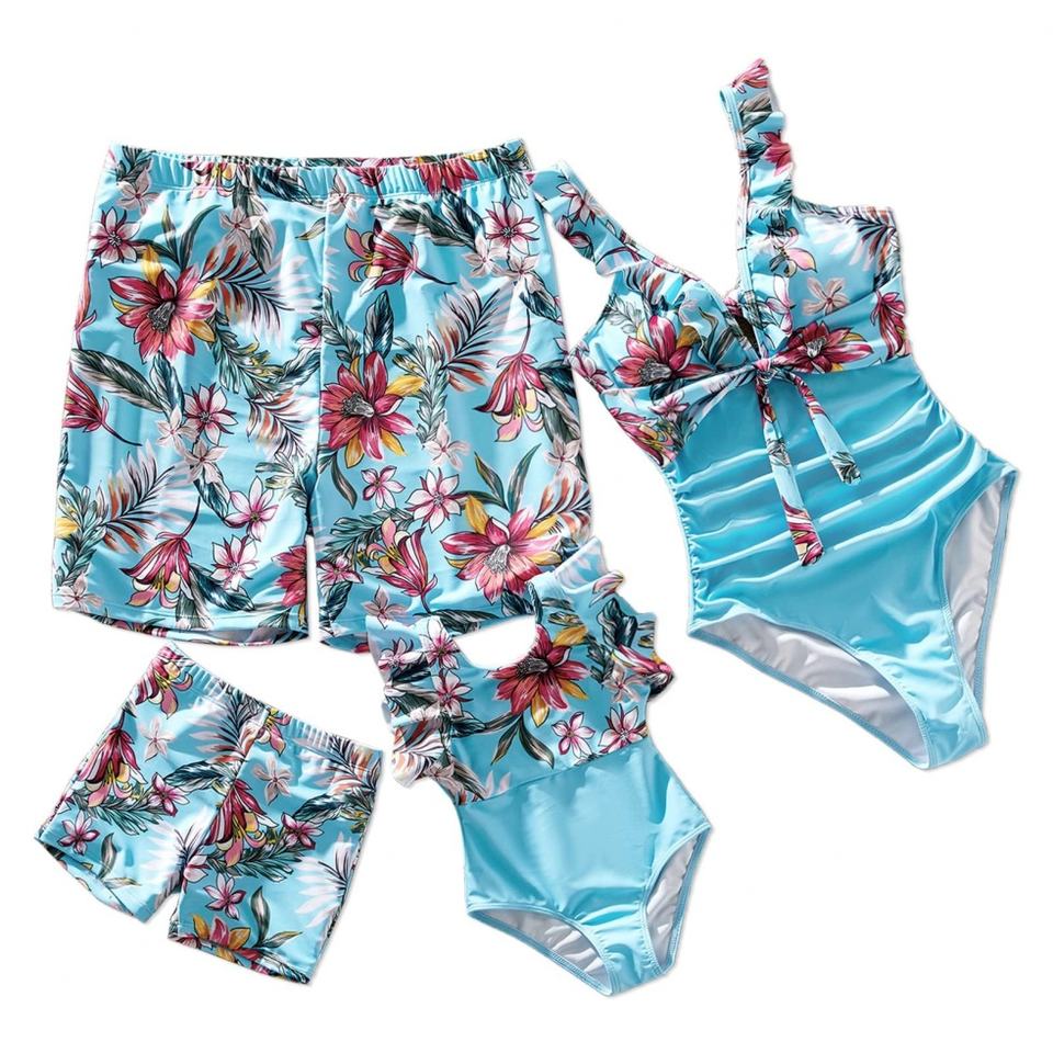 ชุดว่ายน้ำลายดอกไม้แบบหรูหราสำหรับครอบครัว ชุดวันพีซและชุด 4 ชิ้น สำหรับผู้หญิงและผู้ชาย เหมาะสำหรับชายหาดและการว่ายน้ำ