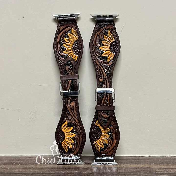Custom Luxury Hand Tooled Genuine Leather Exclusive Straps Sunflower Design Quick Release Fits Unisex High Quality Watch Bands
