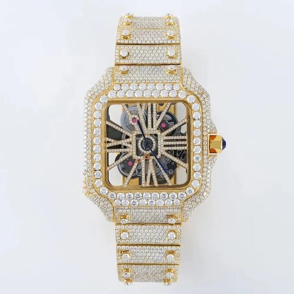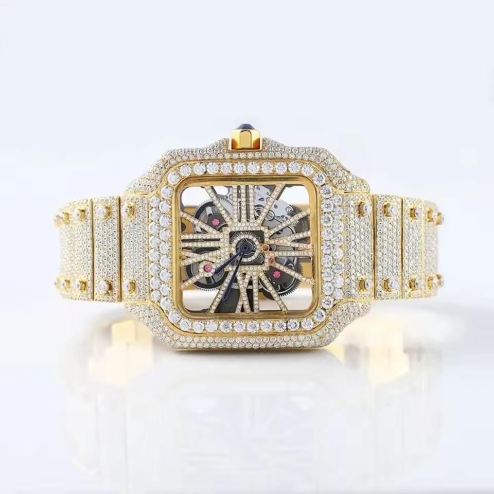 นาฬิกาข้อมือผู้ชายสุดหรูสไตล์ฮิปฮอป ประดับเพชรโมอิสซาไนต์ โครงกระดูก ความใส VVS ชุบทองเหลือง ผลิตจากโลหะผสมสแตนเลส