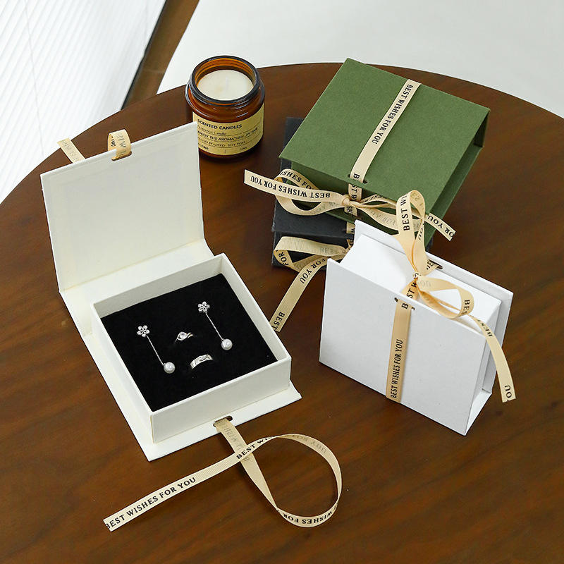 กล่องแสดงเครื่องประดับทรงสี่เหลี่ยมหรูหราแบบสั่งทำดีไซน์เรียบแบบพับได้เรียบง่ายพร้อมริบบิ้น