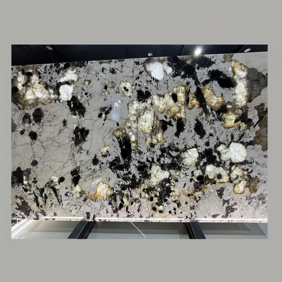 แผ่นหินควอตซ์แพตาโกเนียแบบกำหนดเองสำหรับงานโครงการวิลล์ พร้อมแสงไฟด้านหลัง