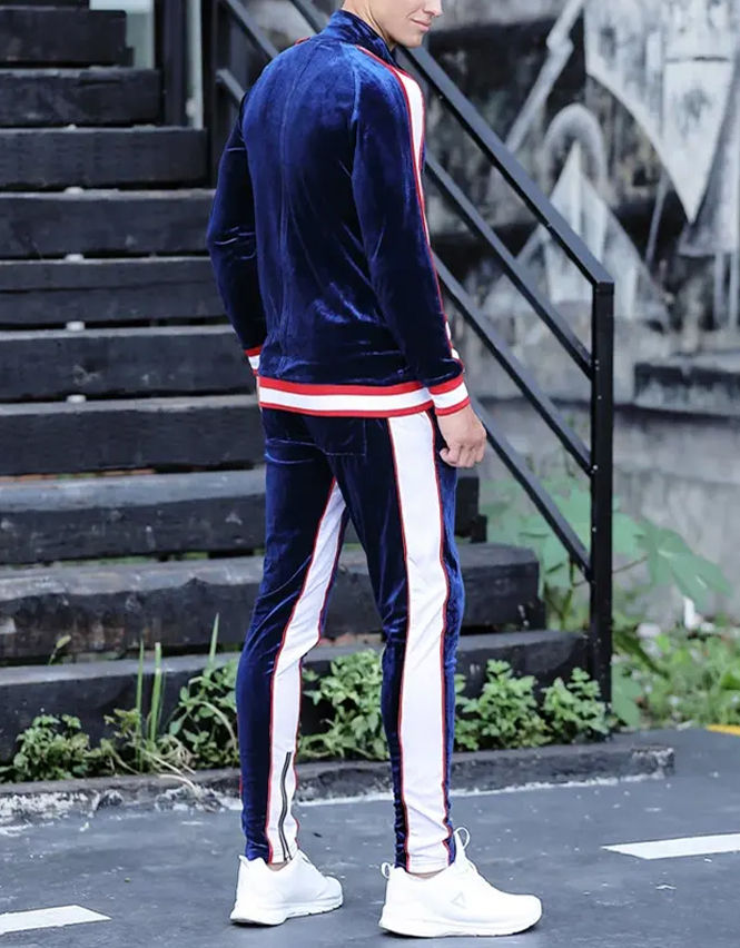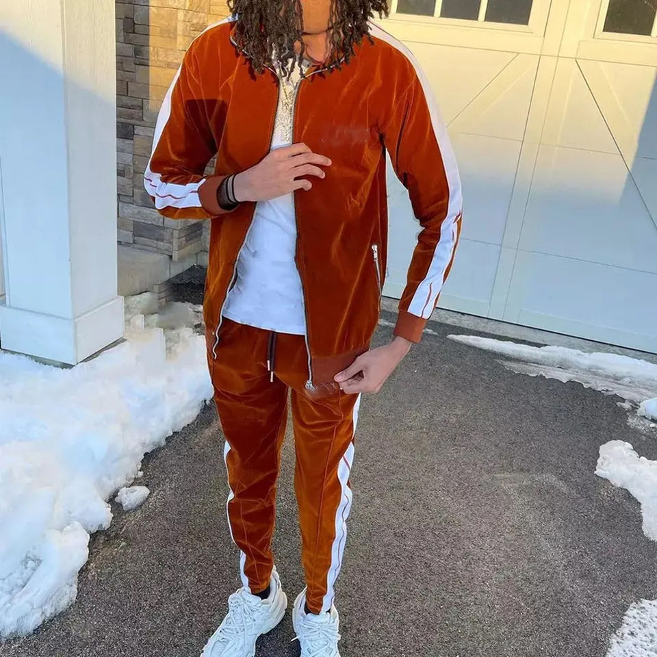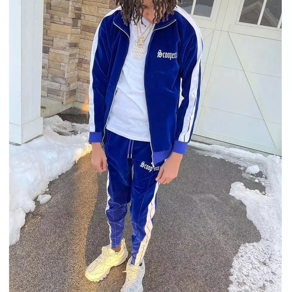 ชุดเซ็ตเสื้อแจ็คเก็ตและกางเกงวอร์มผ้ากำมะหยี่เนื้อหนา สไตล์สตรีทแวร์ลำลอง แต่งแถบข้าง ซิปหน้า ผ้าฝ้าย 100% สำหรับฤดูหนาว ดีไซน์หรูหรา