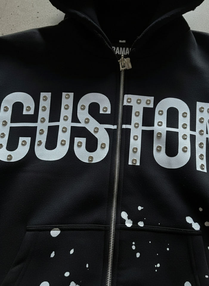 เสื้อฮู้ดดี้ผ้าฟลีซเทอร์รี่คุณภาพสูง ดีไซน์หรูหรา ตกแต่งหมุด พร้อมโลโก้สกรีน ทรงโอเวอร์ไซส์ ทรงบ็อกซี่ ซิปหน้า ยูนิเซ็กส์ สตรีทแวร์