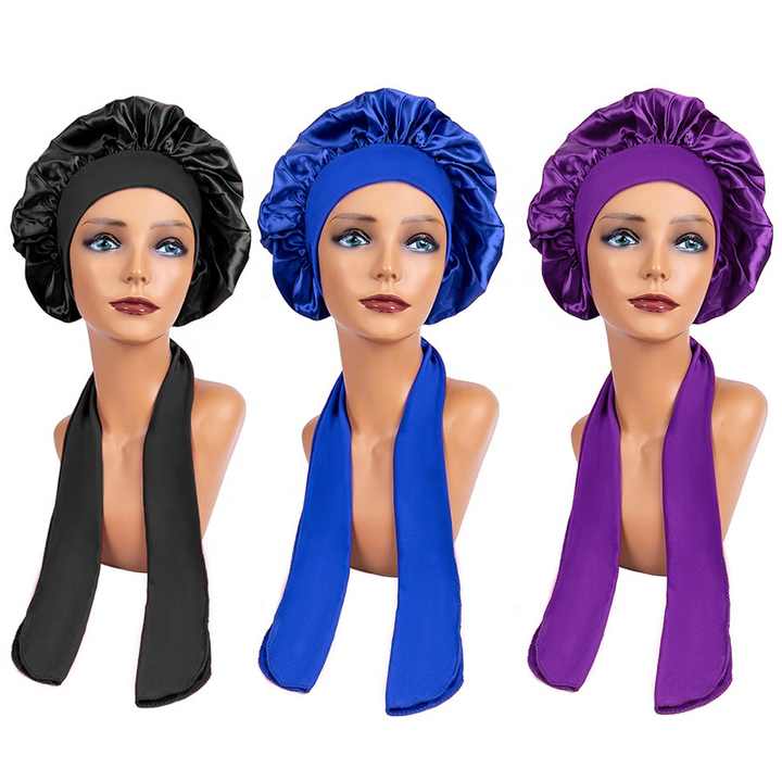 หมวกผ้าซาตินสำหรับผู้หญิงผ้าซาตินคลุมผมถักยาวขนาดใหญ่โลโก้ออกแบบได้ตามต้องการ
