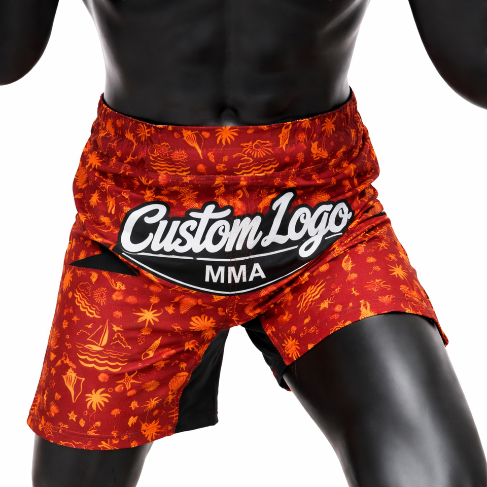 กางเกงชกมวย MMA แบบสั่งทำพิเศษ สไตล์บอร์ดชอร์ต ผ้าสเตรช สำหรับกีฬากราปลิง คิกบ็อกซิ่ง มวยไทย ชุดออกกำลังกายสำหรับต่อสู้ ผู้ผลิต OEM