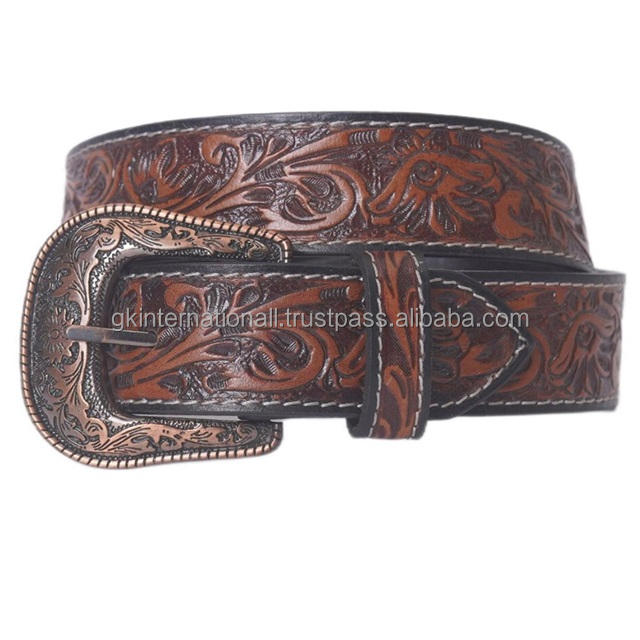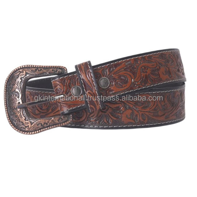 เข็มขัดหนังวัวแท้ตะวันตก40มม. ออกแบบ100% นูนลายดอกไม้ออกแบบได้ตามต้องการ