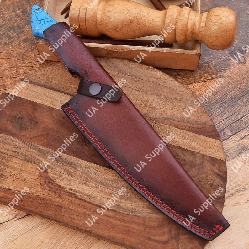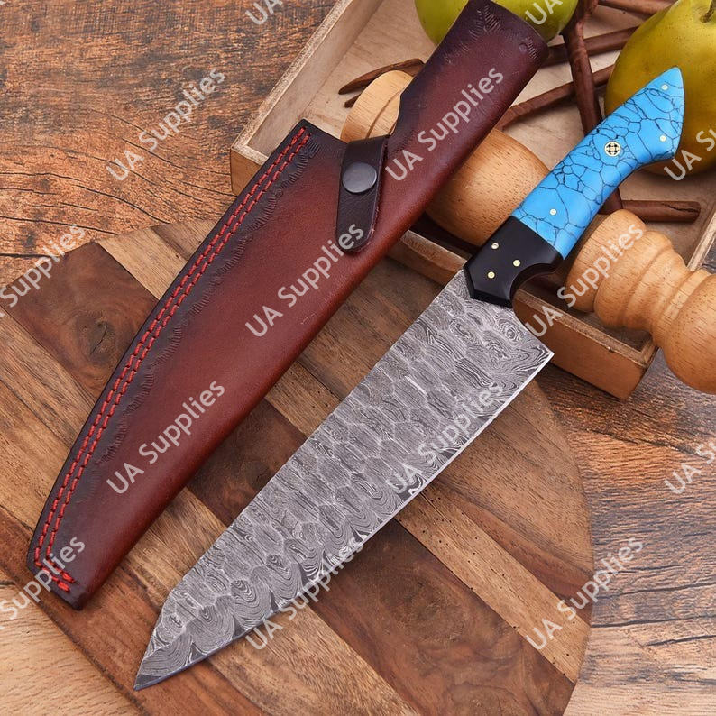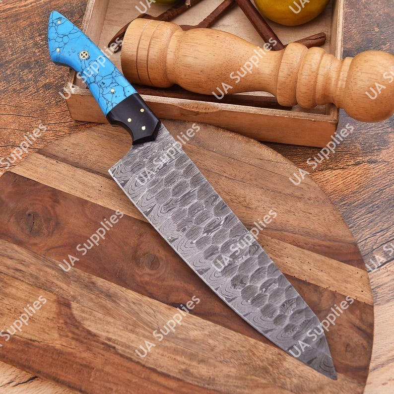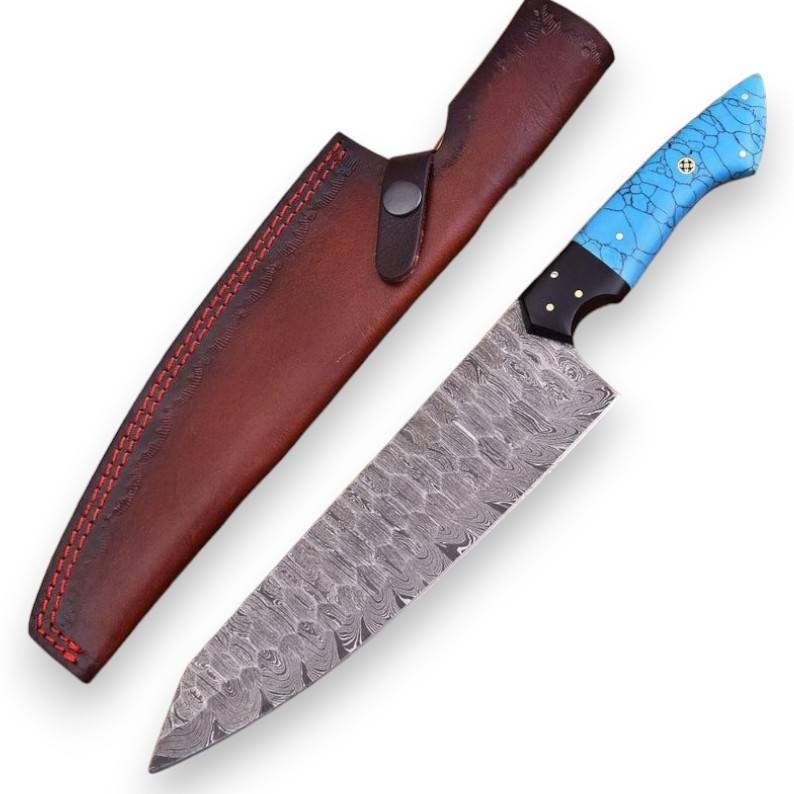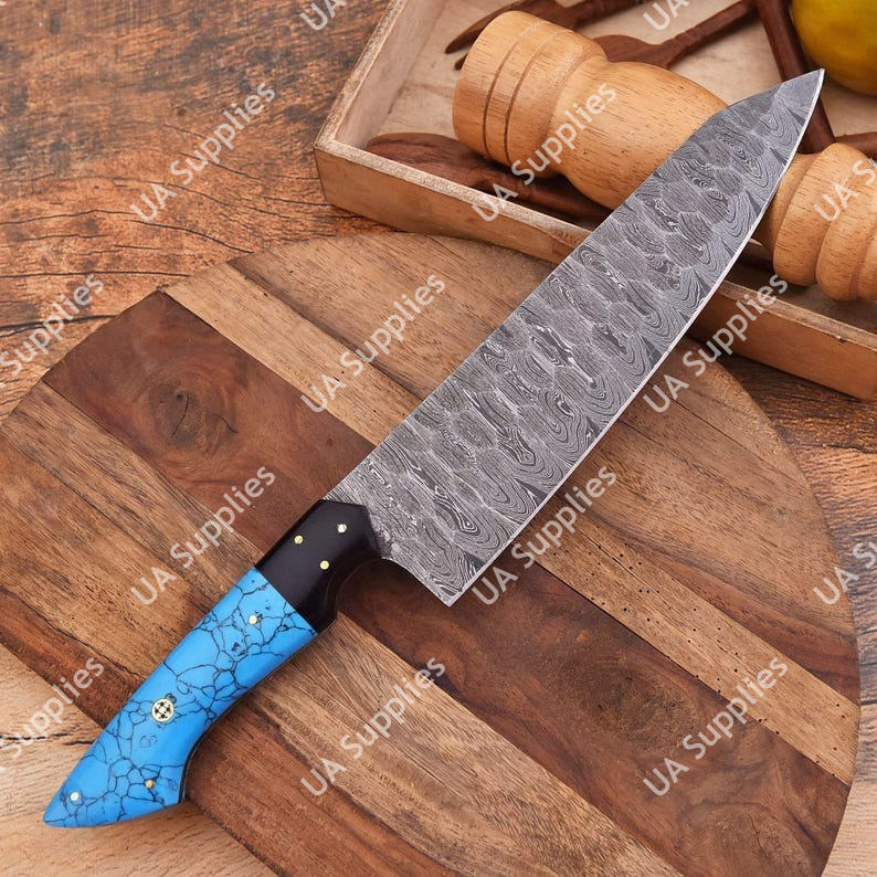 มีดเชฟเหล็กดามัสกัสขนาด 8 นิ้ว ผลิตตามสั่ง ด้ามจับสีเทอร์ควอยซ์ ตีขึ้นรูปด้วยมือ ใช้งานได้ทั้งสองมือ ออกแบบตามหลักสรีรศาสตร์ ทนทาน เป็นมิตรกับสิ่งแวดล้อม