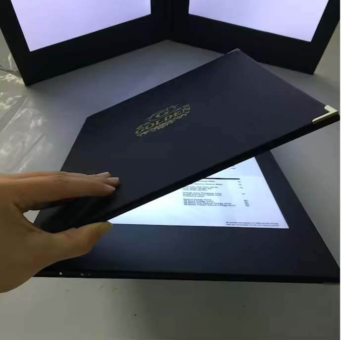 ฝาครอบเมนูไวน์ไฟแบคไลท์แบบ A4ทำเอง PU สีฟ้าพร้อมโลโก้พิมพ์ยูวีกล่องไฟโฆษณาสุดหรู