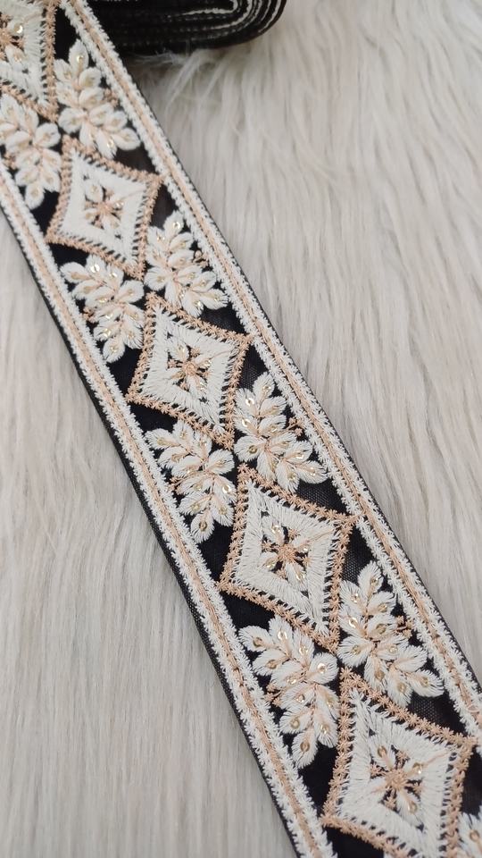ริบบิ้นออร์แกนซ่าผสมผสานลายดอกไม้เรขาคณิต ออกแบบและปักด้วยเครื่องจักร เป็นมิตรกับสิ่งแวดล้อม ขนาดกว้าง 1.5 นิ้ว สำหรับสุภาพสตรี