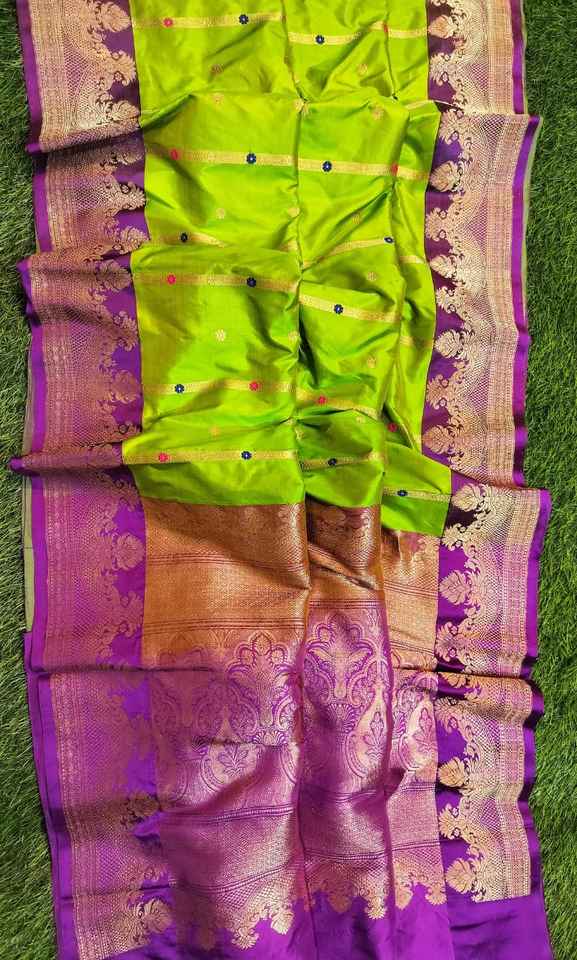 ชุดส่าหรีผ้าไหมแบบสั่งทำสำหรับขายคืนโดยนักออกแบบเสื้อผ้าสีเขียวและขอบสีแดงเข้ม