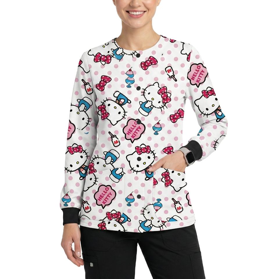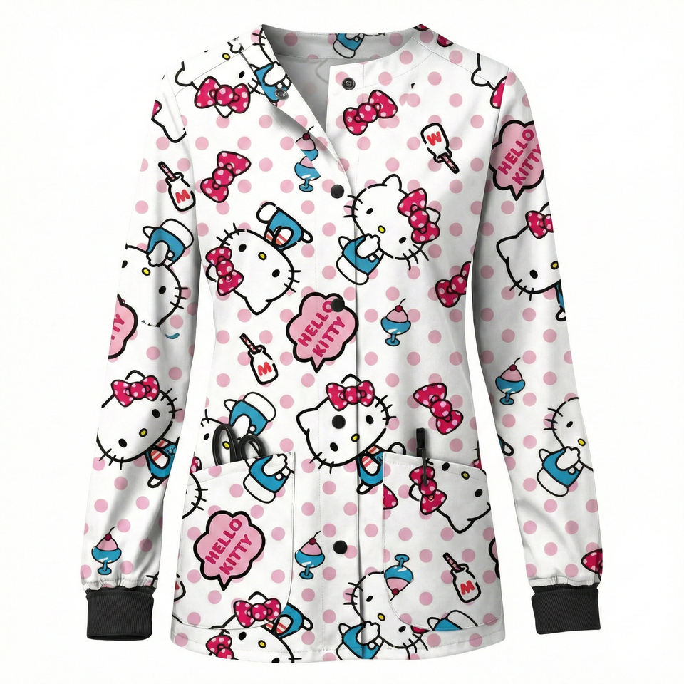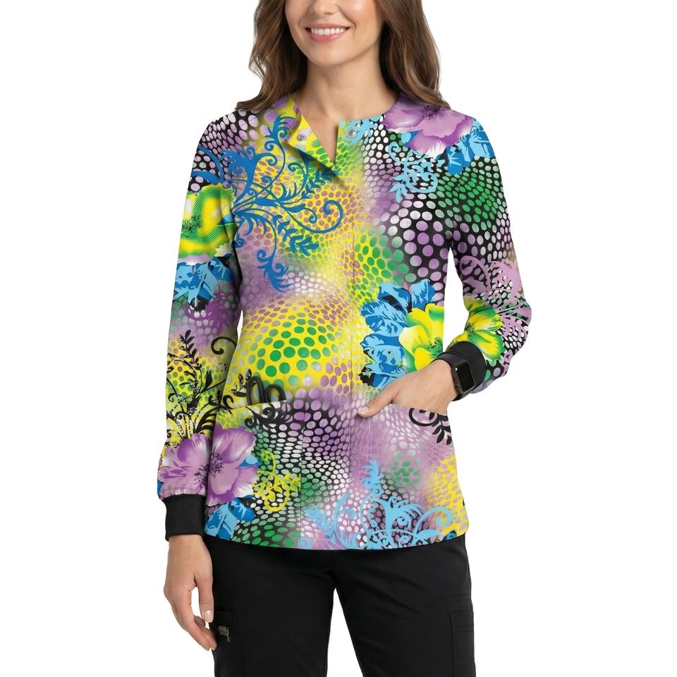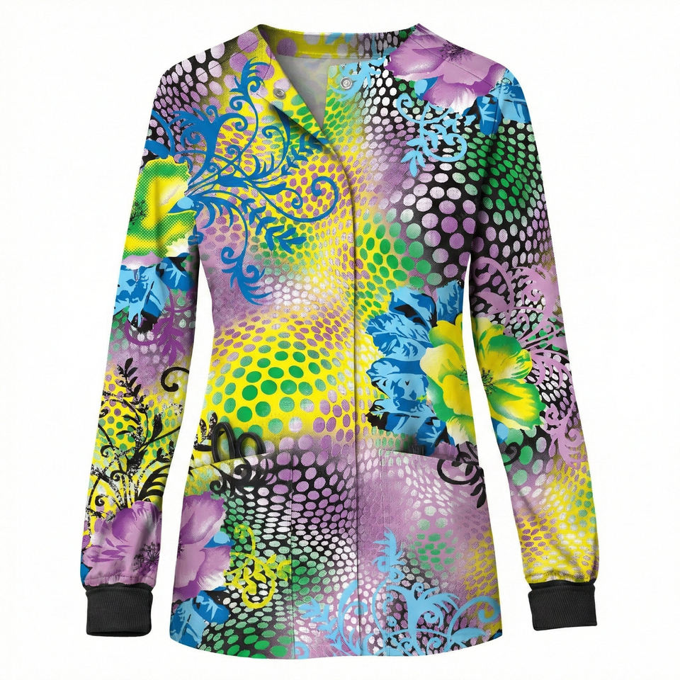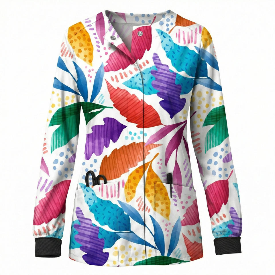 เสื้อสครับพิมพ์ลายดอกไม้สั่งทำจำนวนมาก แขนยาว ติดกระดุมหน้า มีกระเป๋าปะ ผู้ผลิตเสื้อสครับแบบ OEM
