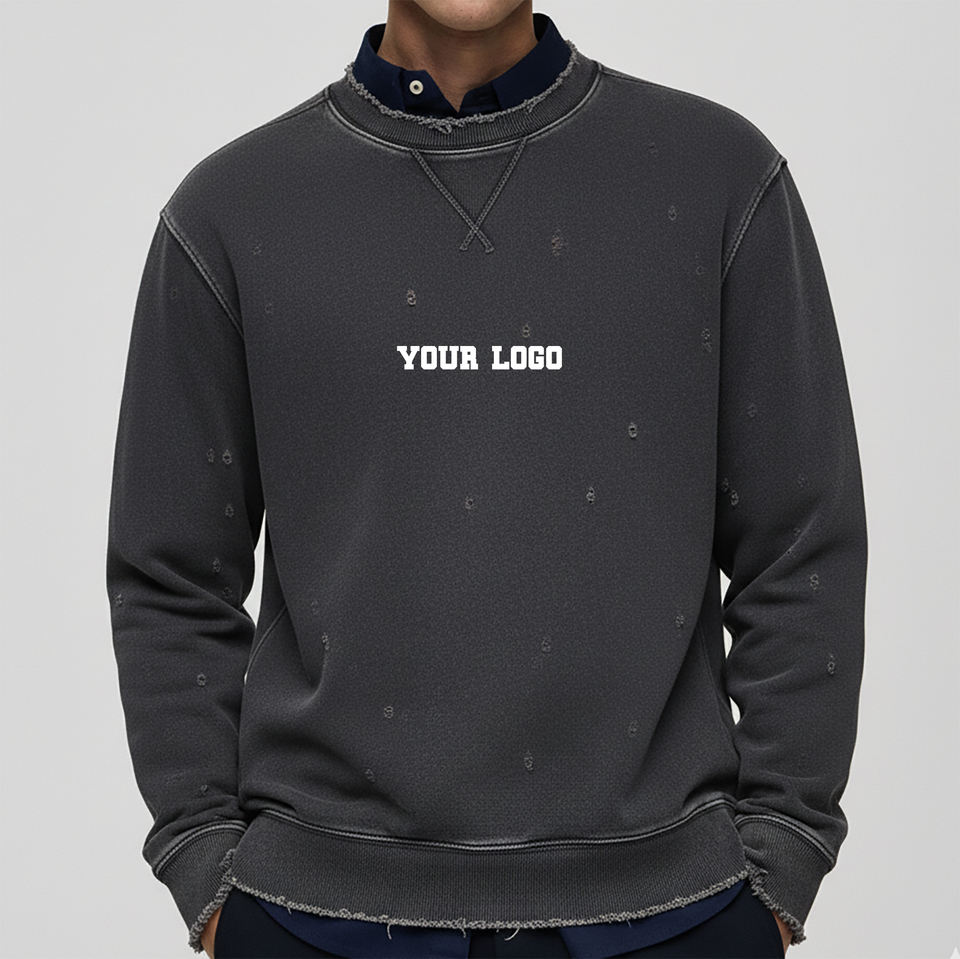 เสื้อฮู้ดดี้ผ้าฝ้าย 100% ระบายอากาศได้ดี สไตล์ฮิปฮอป คอโอ ทรงหลวม สีพื้น แต่งขาดแบบลำลอง สั่งทำได้