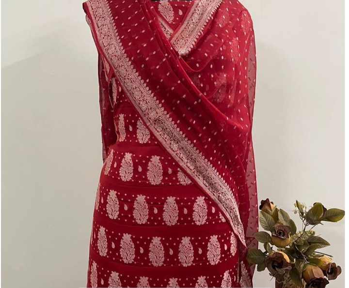 กำหนดเองทำ choli บริสุทธิ์ชุด georgette banarasi กับทอ zari สีเงินในสีแดงเข้มเหมาะสำหรับงานแต่งงานและปาร์ตี้