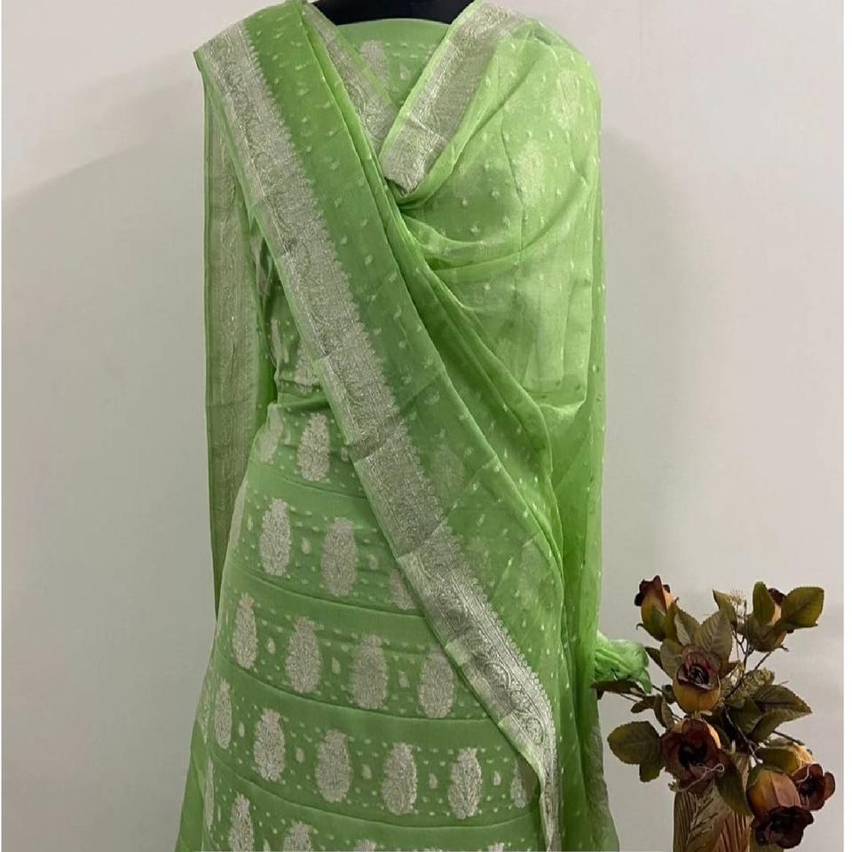 ชุดชอลีสั่งตัดพิเศษ ผ้าคัดดี้จอร์เจตต์แท้ แบบชุดบานาราซี พร้อมงานปักดิ้นเงินสีเหลืองมัสตาร์ด ไม่ยับ สำหรับงานแต่งงาน
