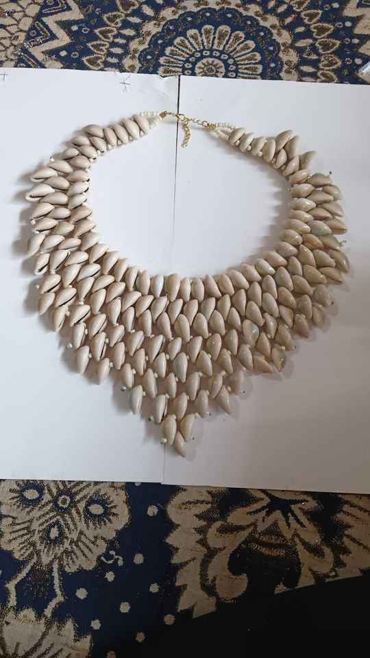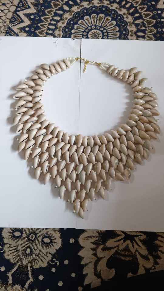 สร้อยคอและสร้อยเปลือกหอยทำจากหนังวัวทำจากเปลือกหอยธรรมชาติที่ออกแบบมาสำหรับการขายต่อโดยการออกแบบเครื่องประดับ