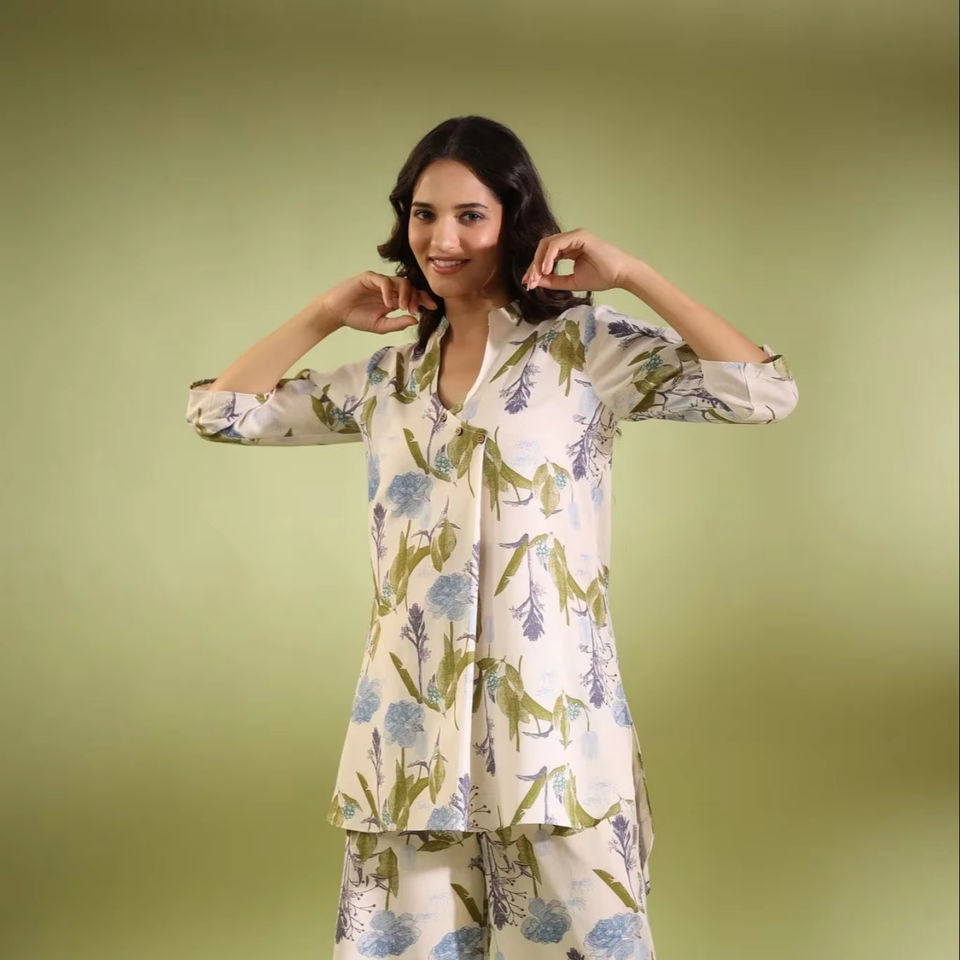 เซ็ตชุดนอนพิมพ์ลายดอกไม้100% ทำจากผ้าฝ้ายสีเขียวอ่อนและสีขาวสวมใส่สบายออกแบบได้ตามต้องการสำหรับการขายต่อ