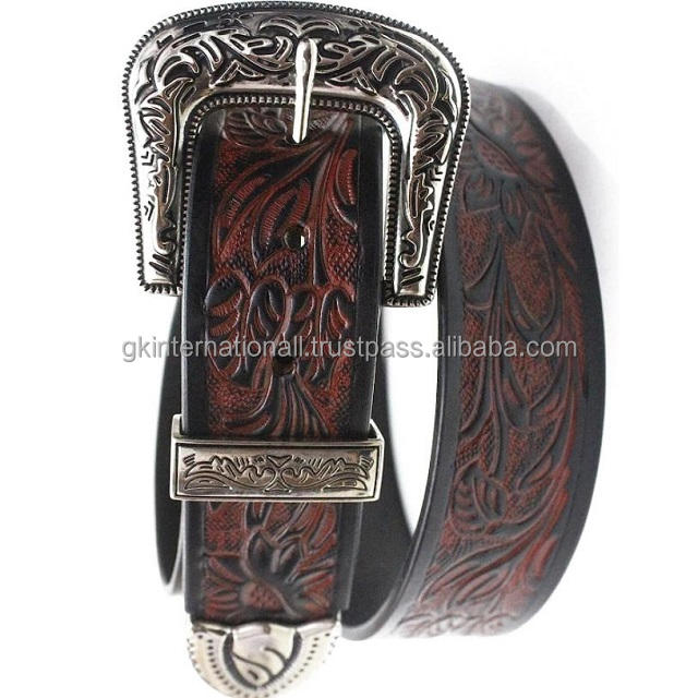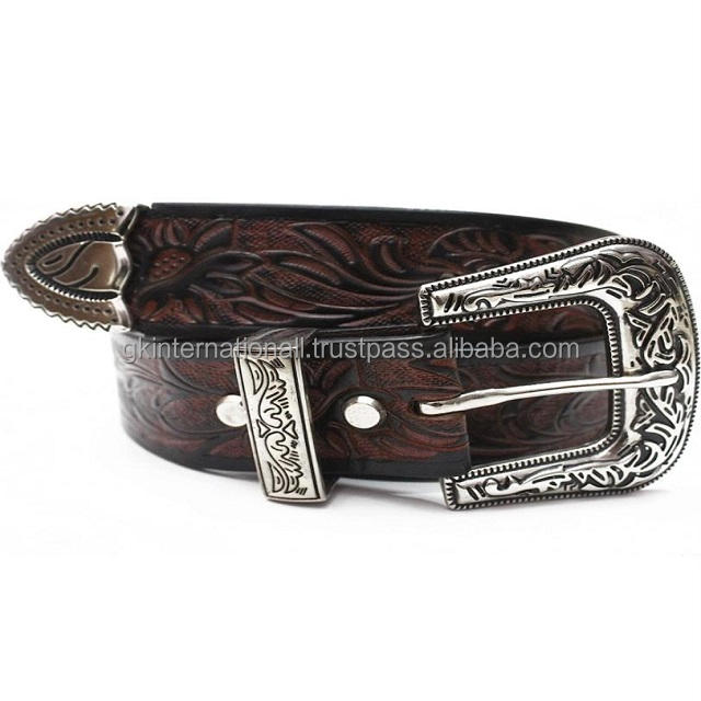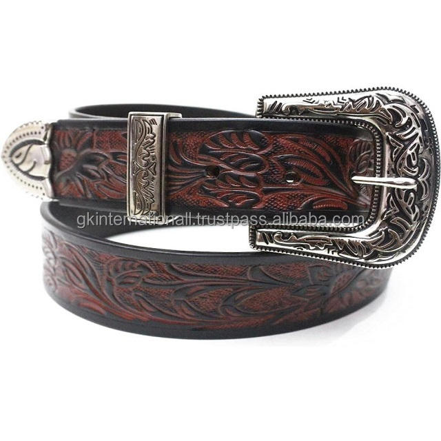 เข็มขัดหนังวัวแท้สำหรับผู้ชายพร้อมชุดหัวเข็มขัดลายดอกไม้สลักลายใบไม้แบบตะวันตกงานตามสั่ง