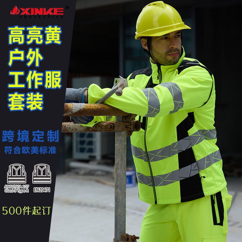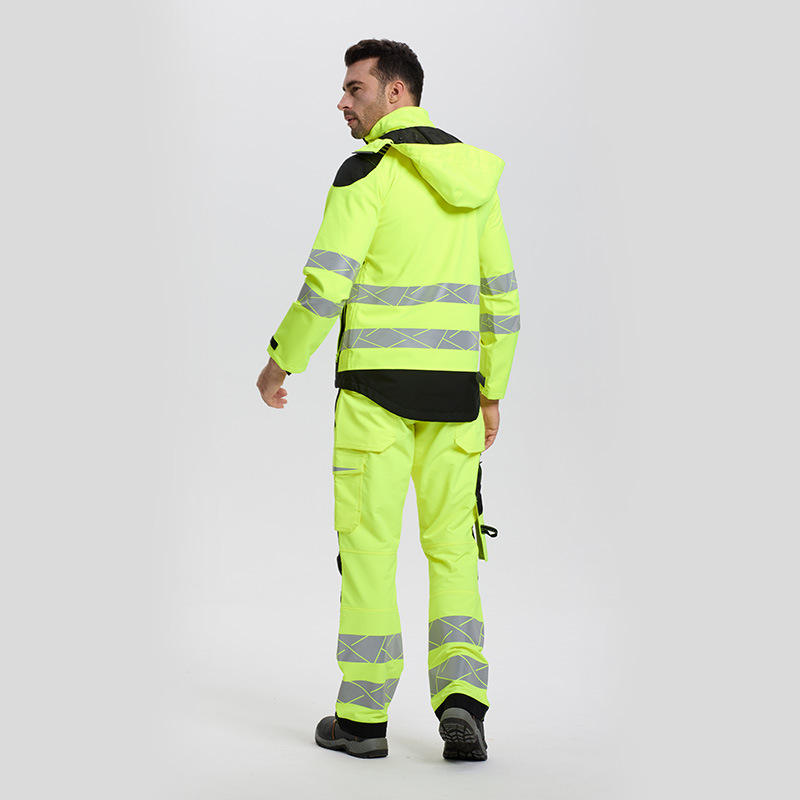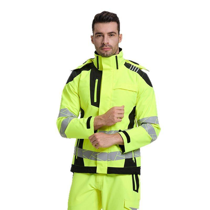 ชุดทำงานสีเหลืองความสว่างสูงแบบสั่งทำพิเศษสำหรับโรงงานพร้อมแถบสะท้อนแสงและหมวกถอดได้