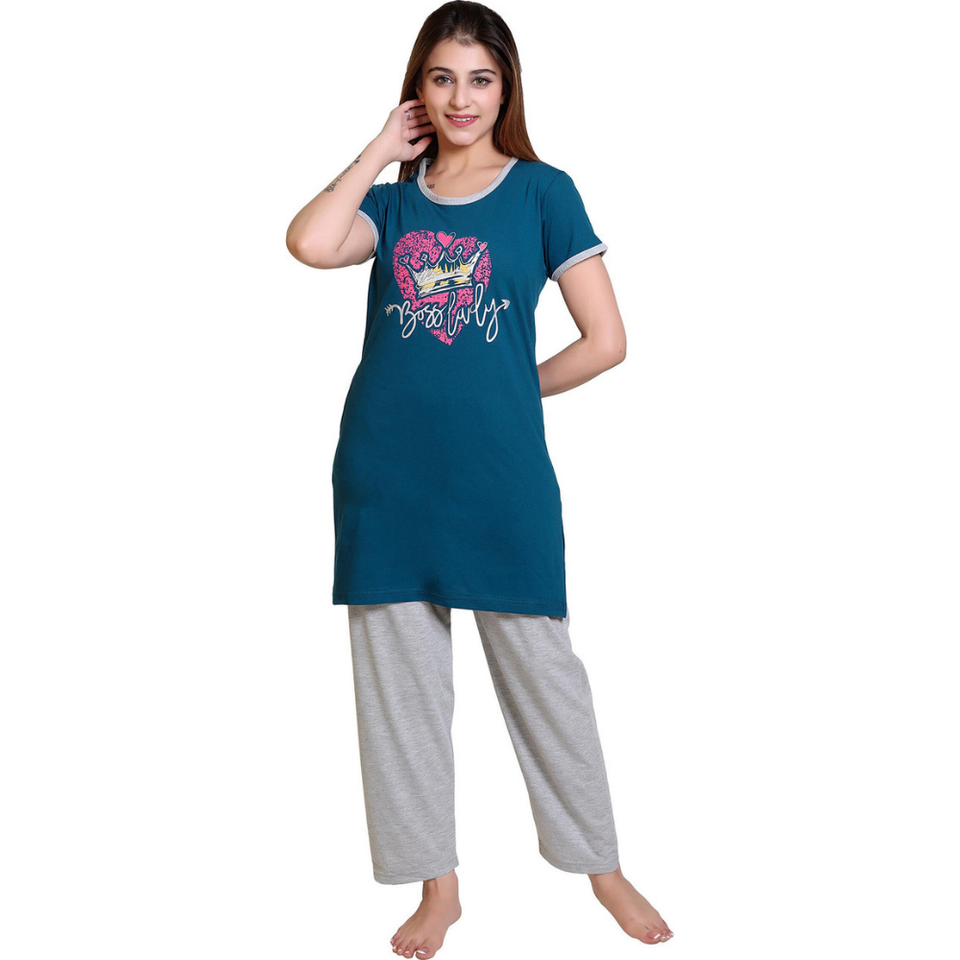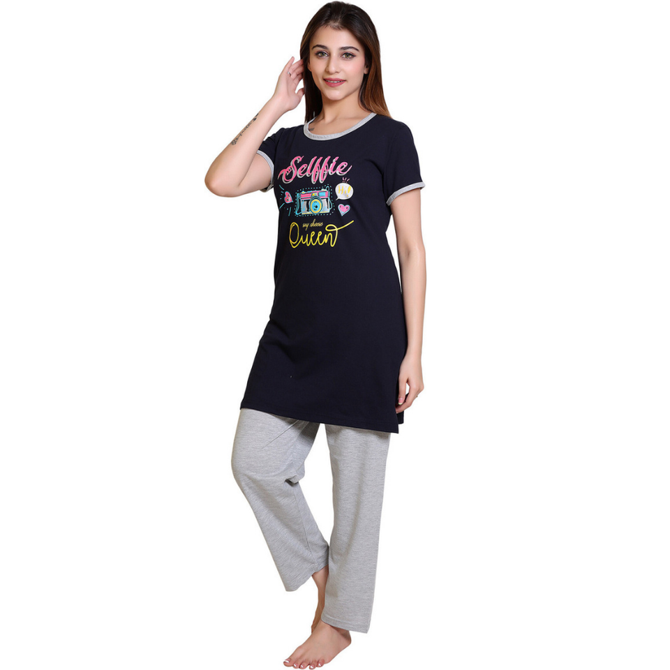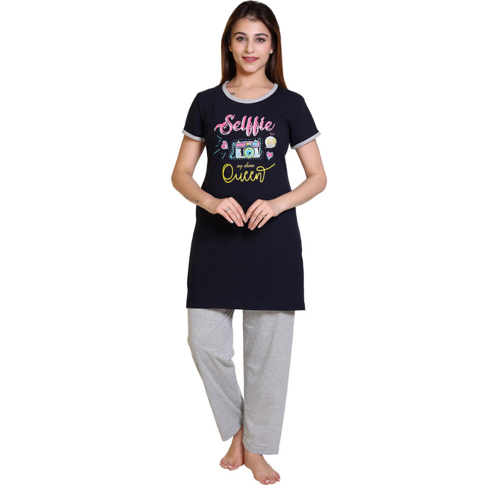 ชุดนอน2ชิ้นสำหรับผู้หญิงชุดนอนแขนสั้นผ้าฝ้ายพิมพ์ลายเต็ม