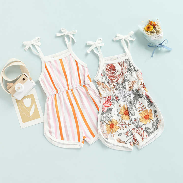 ชุดรอมเปอร์เด็กผู้หญิงลายทางดอกไม้สำหรับฤดูร้อน พร้อมสายรัดไหล่แบบผูกเอง ชุดบอดี้สูทเด็กอ่อน/เด็กวัยหัดเดิน รับทำโลโก้ตามสั่ง