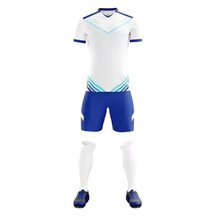 ชุดเสื้อรักบี้และกางเกงขาสั้นแบบสั่งทำพิเศษสำหรับทีมกีฬาฟุตบอล สีขาว-น้ำเงิน แขนสั้น