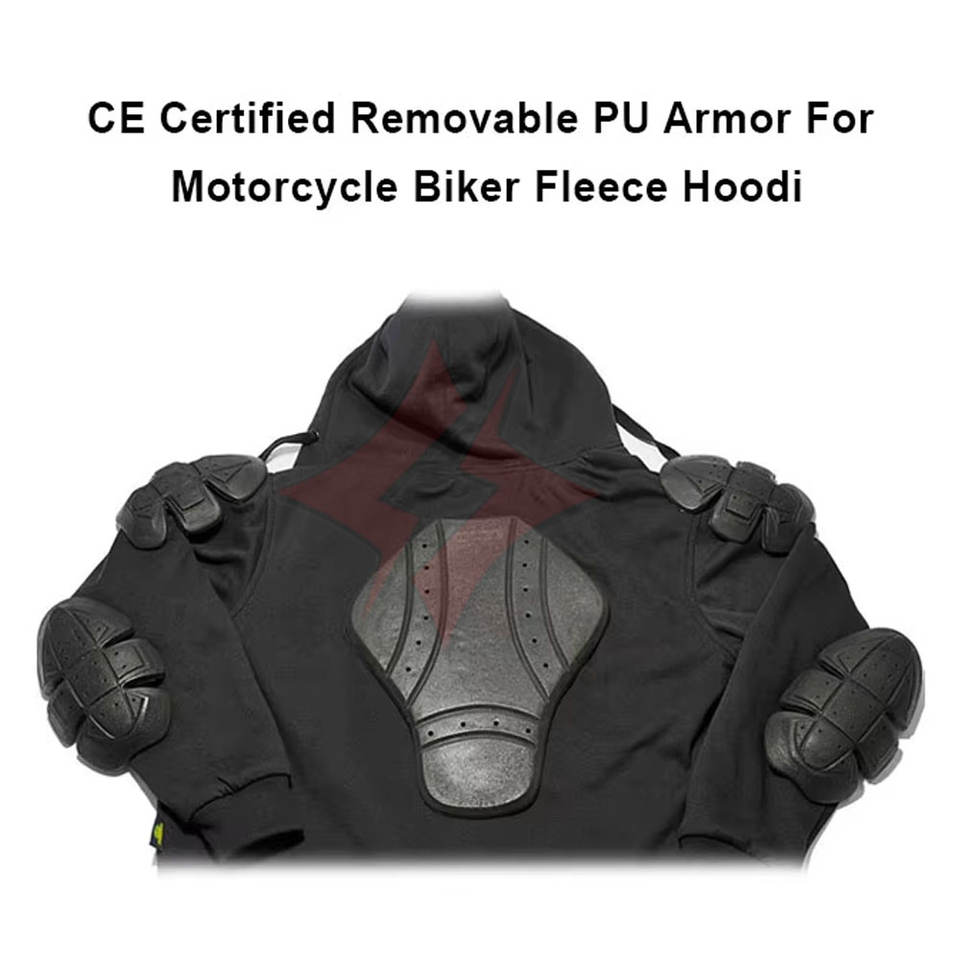 เสื้อฮู้ดดี้ผ้าฟลีซสีดำสำหรับผู้ชายสั่งทำพิเศษ พร้อมแผ่นป้องกัน CE เสริมความแข็งแรงบริเวณข้อศอก หลัง และแขน เสื้อฮู้ดดี้สำหรับขี่มอเตอร์ไซค์คุณภาพพรีเมียม