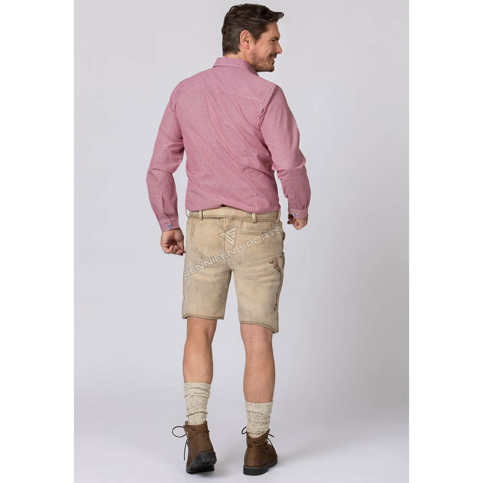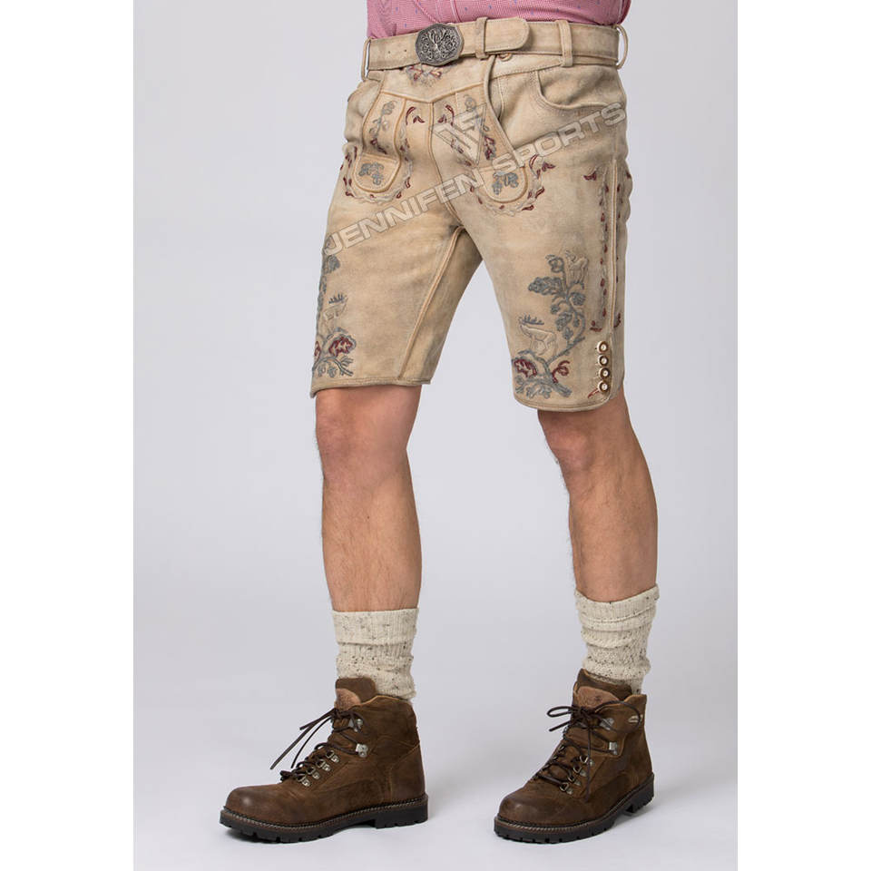 ผู้ชายทําเอง Lederhosen หนังวัวสั้นหนังนิ่มปุ่มเย็บปักถักร้อยด้านหน้าปิดด้านข้างและกระเป๋าด้านหลังพร้อมห่วงเข็มขัด