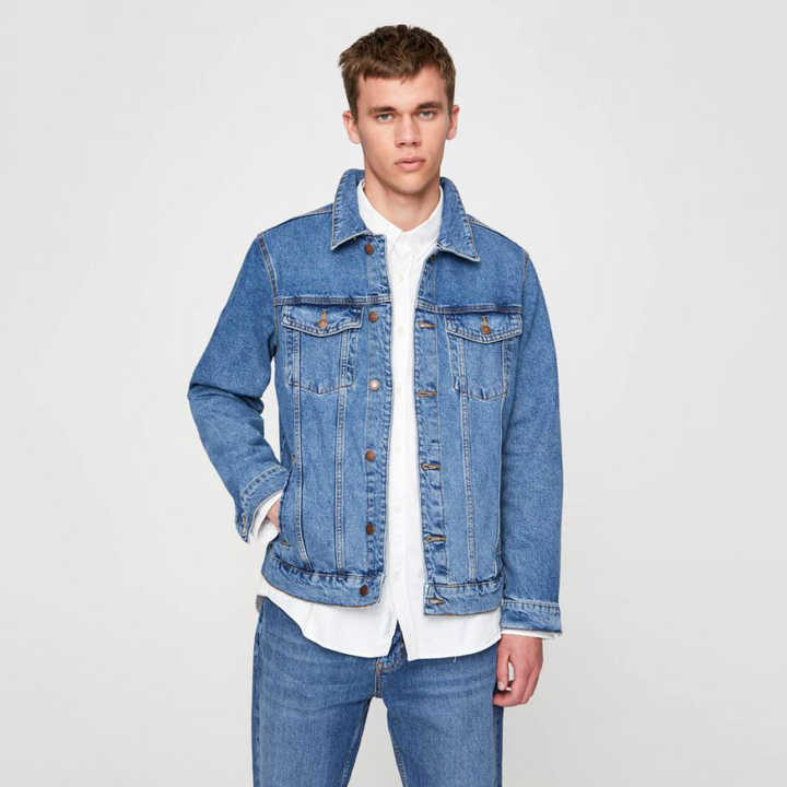 แจ็กเก็ตผ้ายีนส์สีน้ำเงินสำหรับผู้ชายเสื้อแจ็กเก็ตยีนส์ผ้าฝ้ายยืดแบบสั่งตัดดีไซน์เรียบพร้อมโลโก้ด้านหน้าขนาดใหญ่พิเศษสำหรับฤดูหนาว