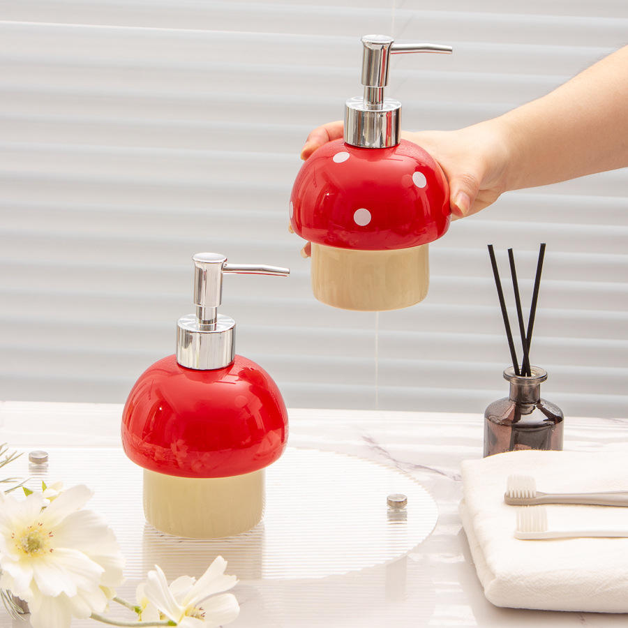 ขวดสบู่เซรามิคทรงเห็ดสีแดงแบบสั่งทำพิเศษ พร้อมลายตกแต่ง สำหรับวางบนโต๊ะ เติมได้ เหมาะสำหรับห้องน้ำ ใช้กับเจลอาบน้ำ โลชั่น