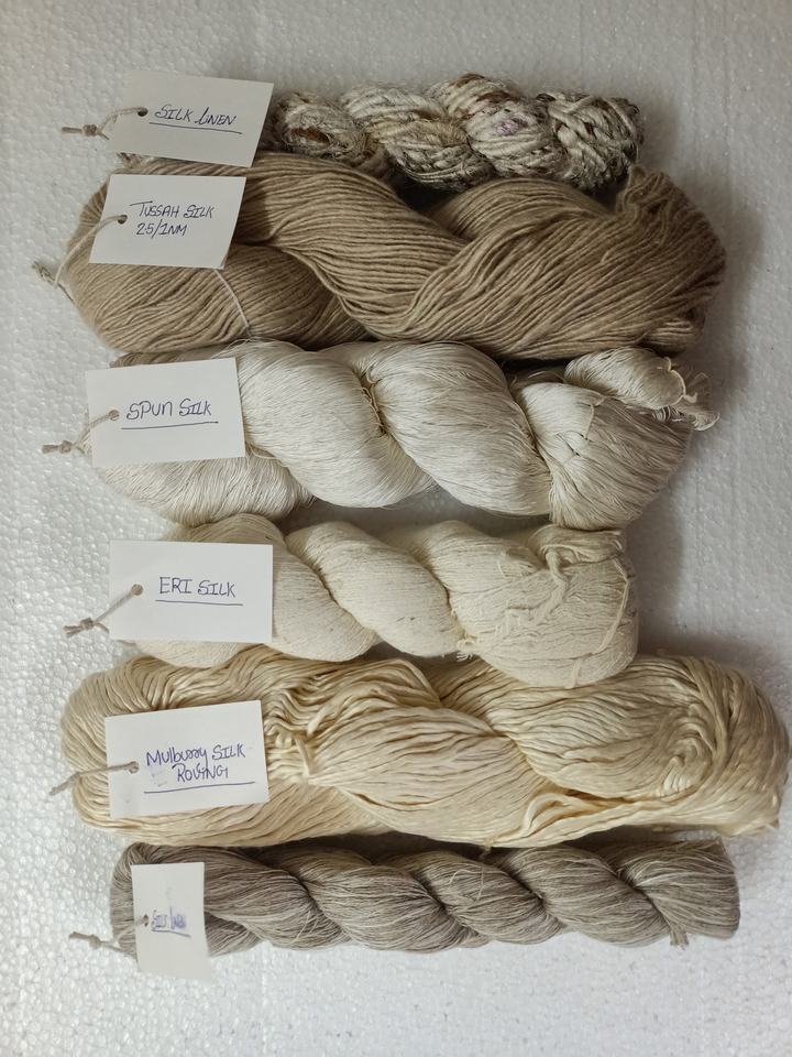 ไหมพรมธรรมชาติทอมือแบบสั่งทำพิเศษในรูปแบบม้วนสำหรับการย้อมสี รวมถึงไหมมัลเบอร์รี่ ไหมทัสซา ไหมและเส้นใยจากร้านขายไหม