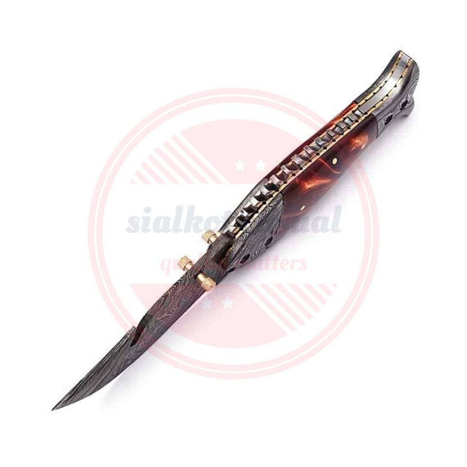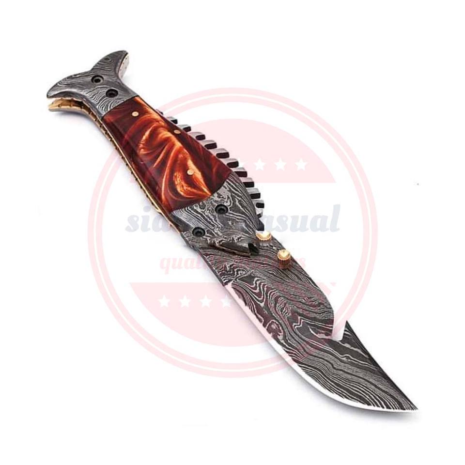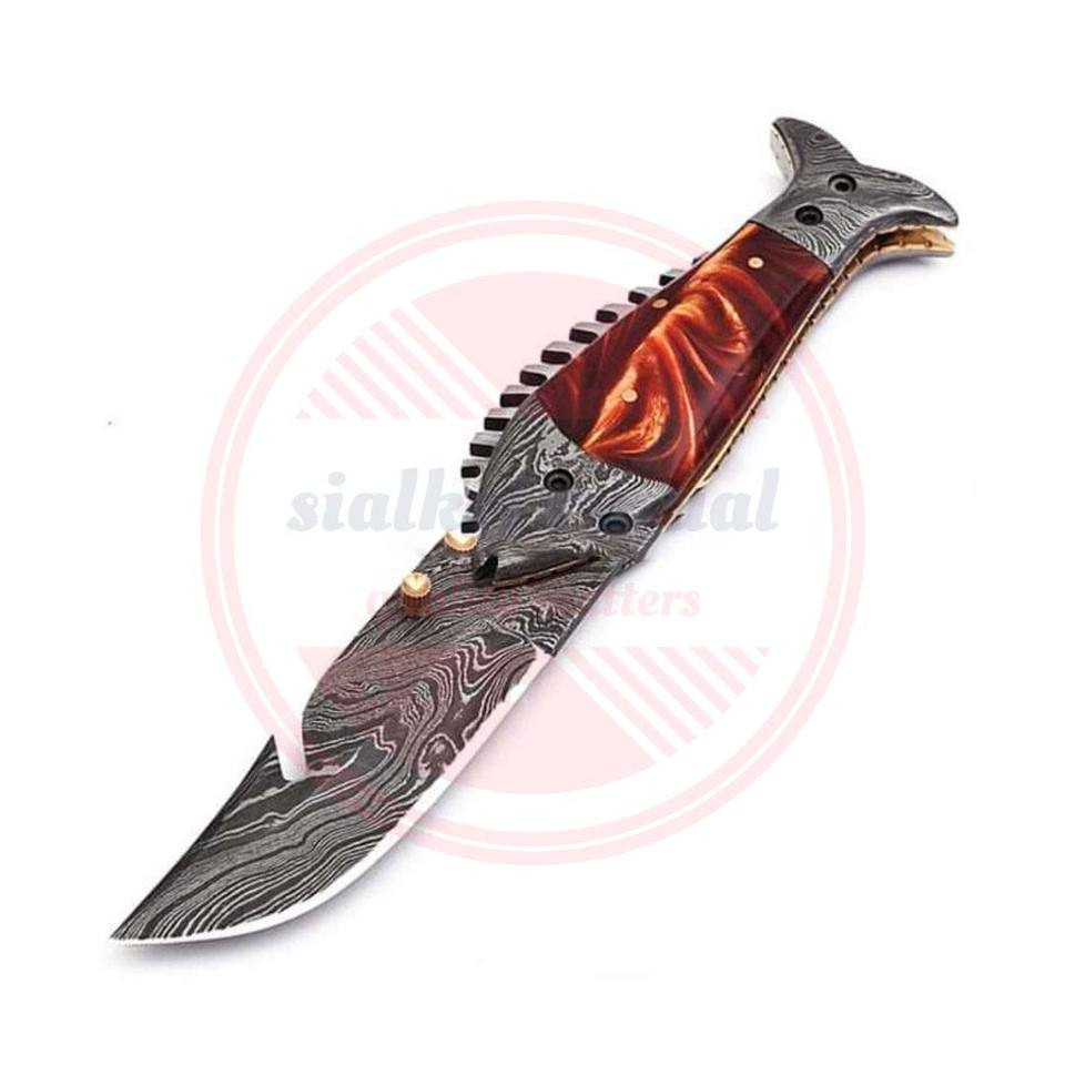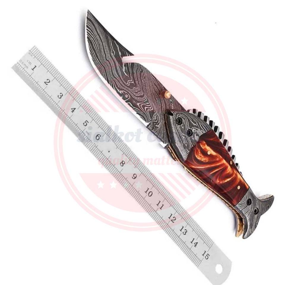มีดพับตั้งแคมป์กลางแจ้งทำจากเหล็กดามัสกัสมีดพับยุทธวิธีมีปลอก