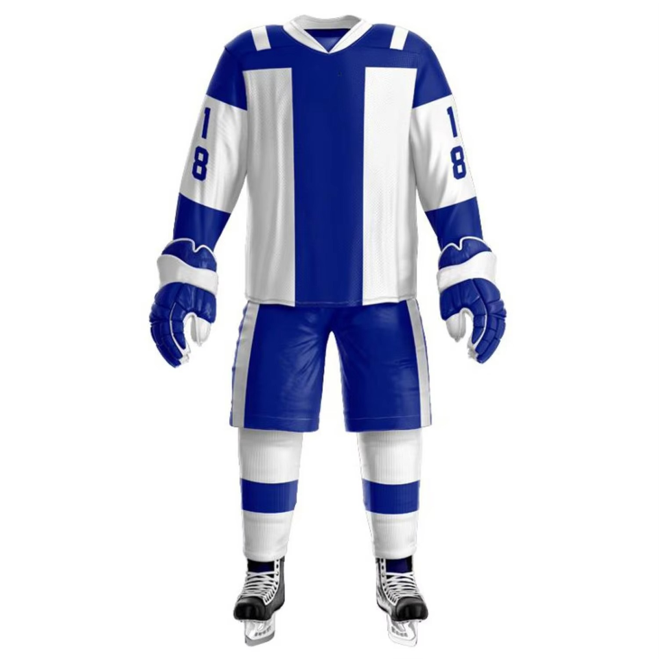 ชุดยูนิฟอร์มฮอกกี้น้ำแข็งแบบสั่งทำพิเศษ 100% โพลีเอสเตอร์ ระบายอากาศได้ดี ดีไซน์โดดเด่นพร้อมโลโก้ทีมด้านหน้า ขายส่ง