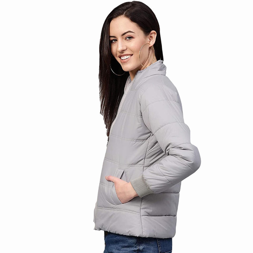 เสื้อแจ็คเก็ตขนเป็ดสำหรับผู้หญิง,เสื้อแจ็คเก็ตแขนยาวสีเทาคอตั้งสำหรับสวมใส่บนถนน