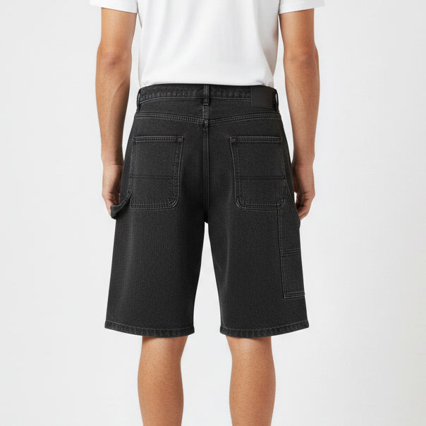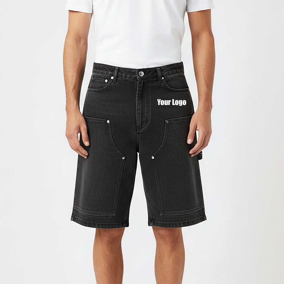 Custom Made Streetwear Front Logo Leg Panels Embroidery Decoration 100% Cotton Solid Denim Shorts Casual Wear Knee Length Raw
