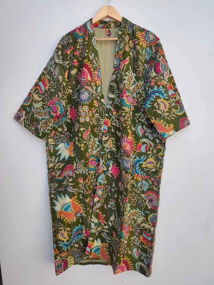เสื้อโค้ทปักลาย Kantha วินเทจสีเขียวดีไซน์ดอกไม้ผ้าฝ้ายพิมพ์ลายสามารถกำหนดขนาดเองได้โดยนักออกแบบ