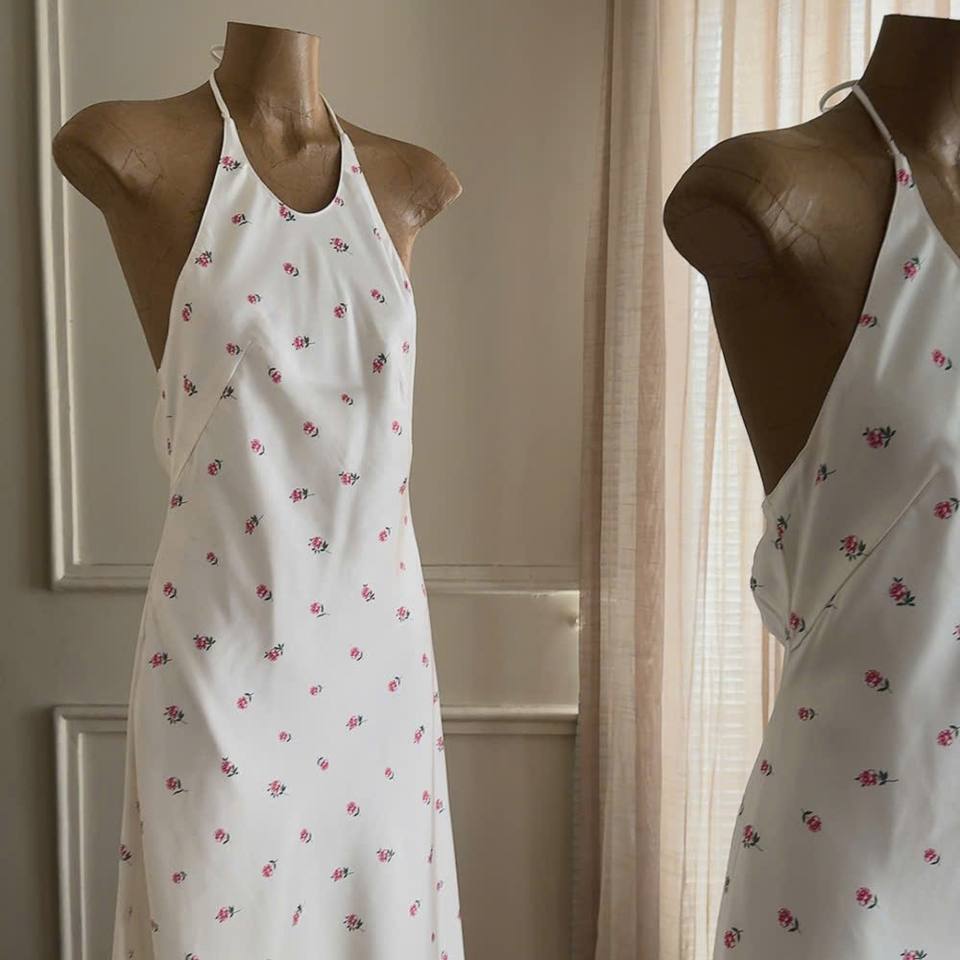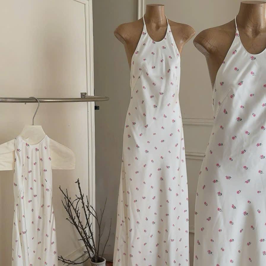 ชุดเดรสยาวสีขาวตาข่ายลายดอกไม้แบบสั่งตัดพิเศษ คอแบบผูกเชือก ไร้แขน สำหรับฤดูร้อนสำหรับผู้หญิง