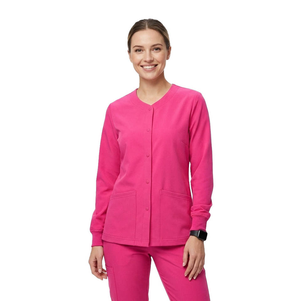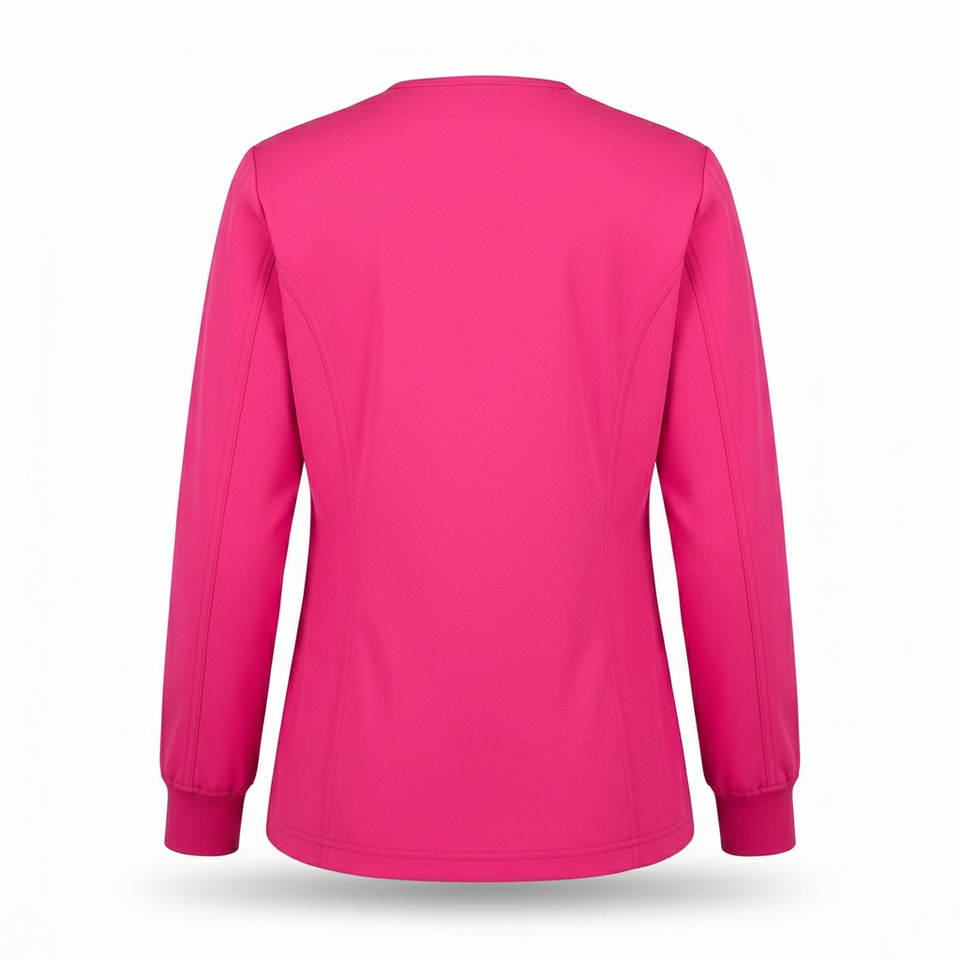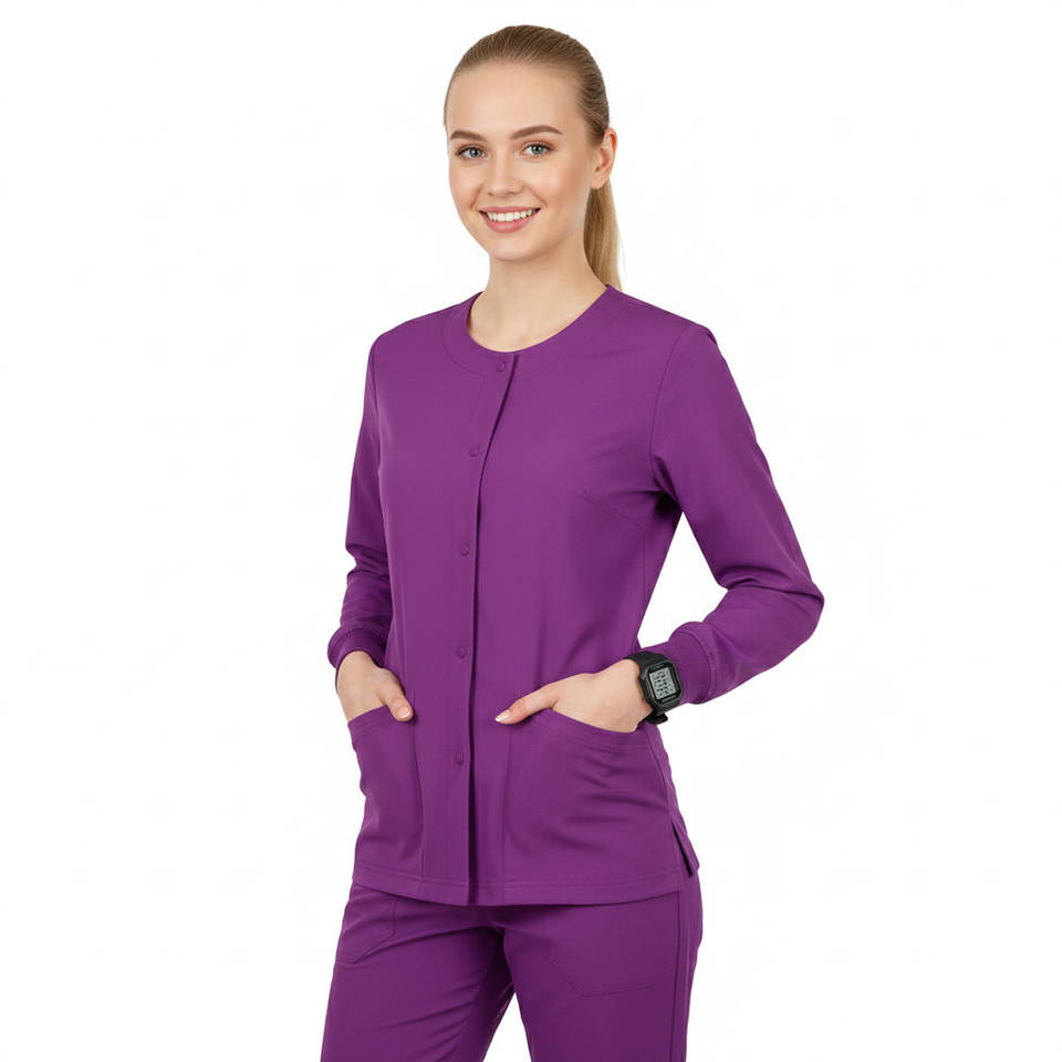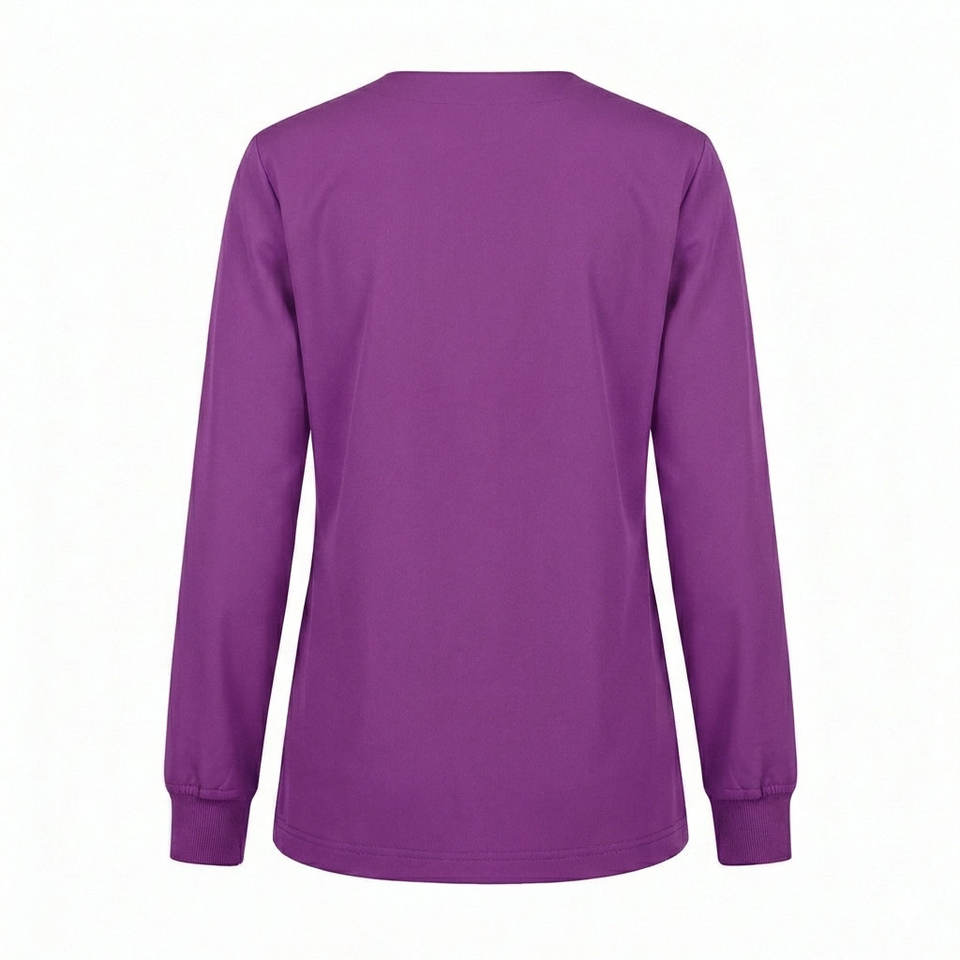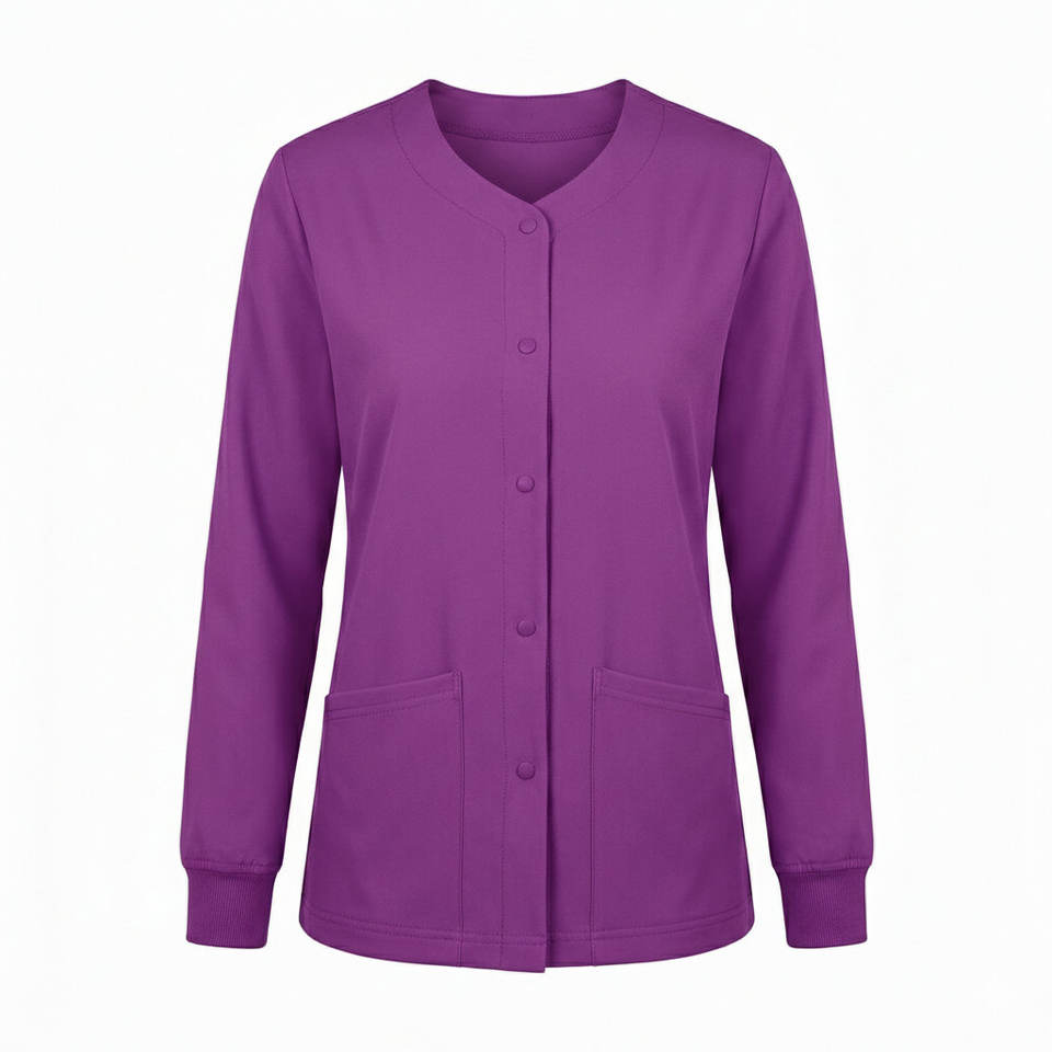 เสื้อสครับสั่งทำขายส่งแบบ OEM กระดุมแป๊กด้านหน้า คอทรงกลม แขนยาว ปลายแขนยางยืด ชุดยูนิฟอร์มแพทย์สำหรับผู้หญิง