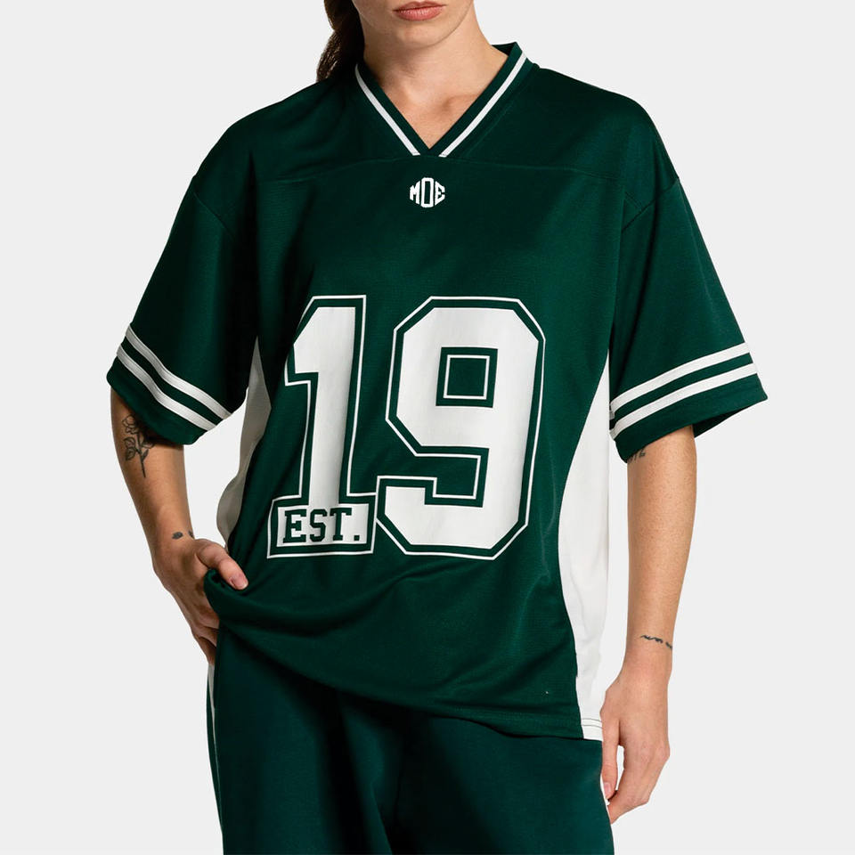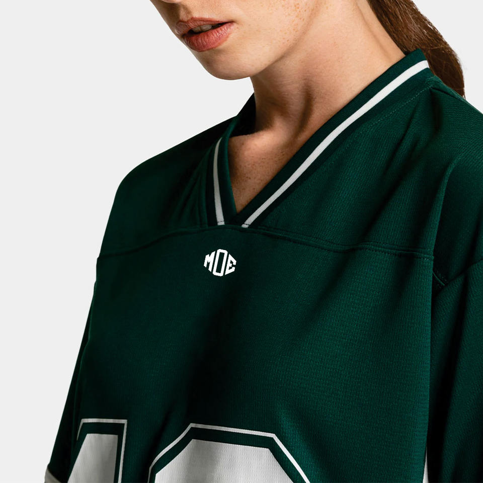เสื้อฟุตบอลอเมริกันสีเขียวแบบตาข่ายคอวีสำหรับผู้หญิงสั่งทำพิเศษ พิมพ์หมายเลขทีมตามสั่ง ทรงหลวม รับผลิตแบรนด์ส่วนตัว OEM จำหน่ายส่ง