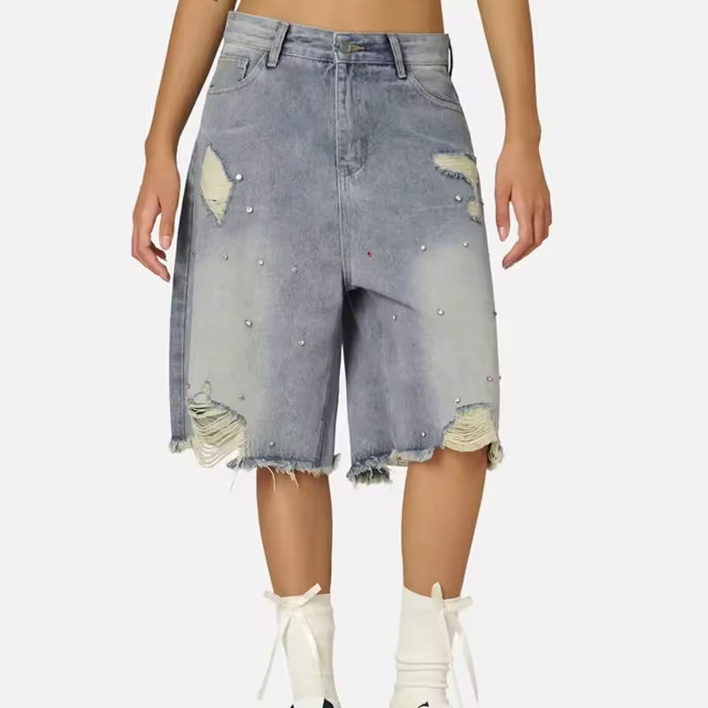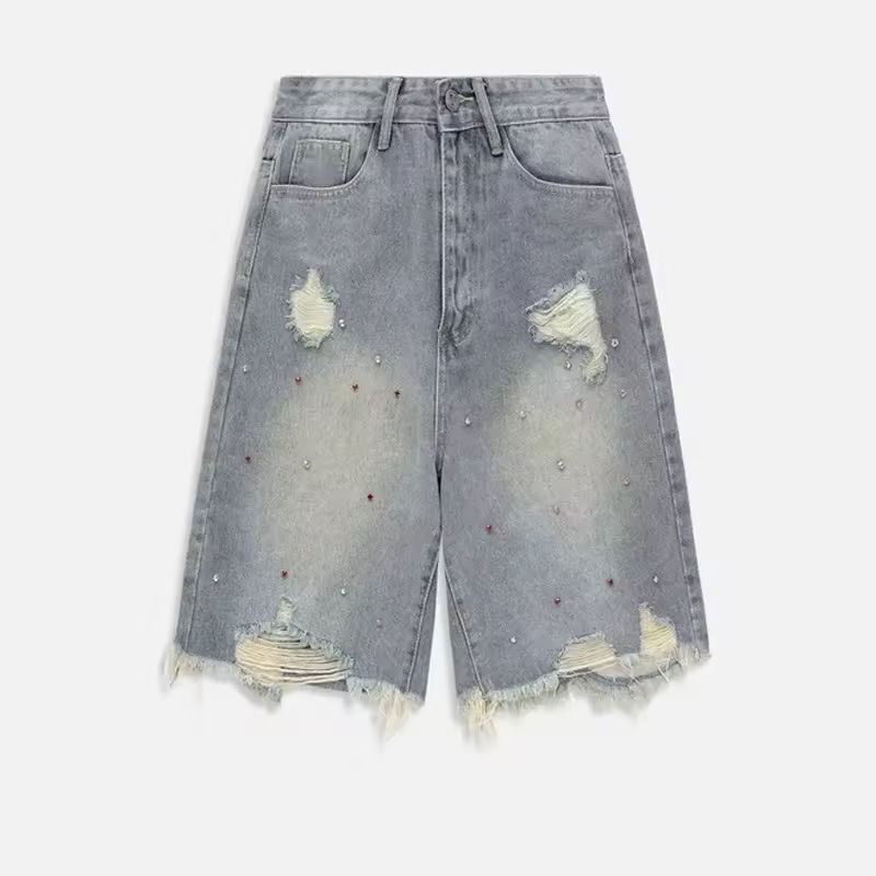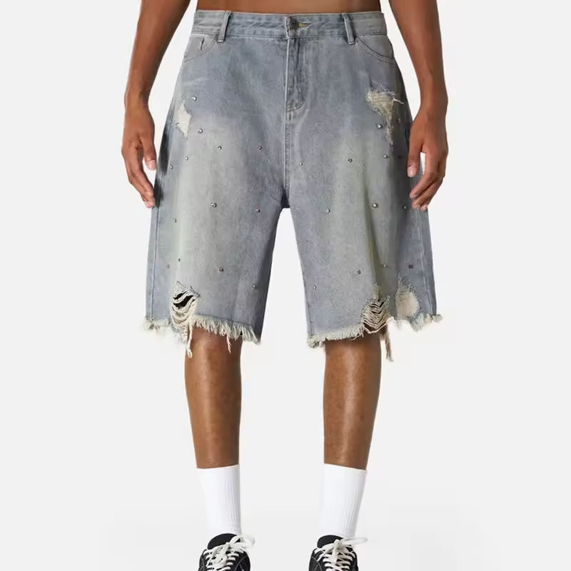 กางเกงยีนส์ขาสั้นผู้ชายแบบกำหนดเอง ประดับด้วยคริสตัล แต่งขอบขาดๆ สไตล์ฤดูร้อน