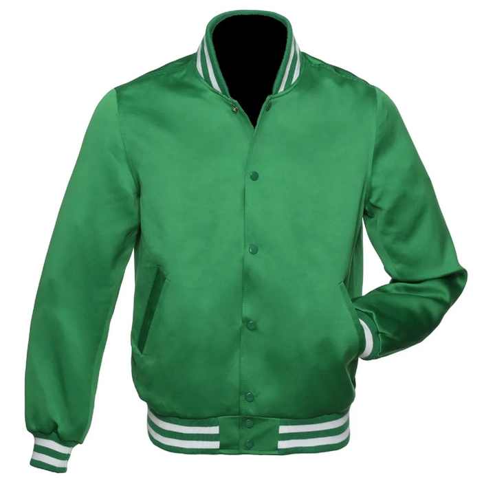 ผู้ผลิตเสื้อแจ็คเก็ตเบสบอลแบบสั่งทำสไตล์ไฮสตรีท สีเขียวซาติน พร้อมกระเป๋าหน้าแบบตั้ง สำหรับวิทยาลัย