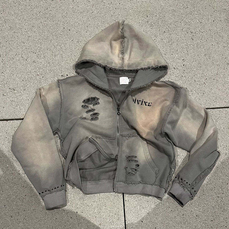 ผู้ผลิตเสื้อผ้าสตรีทแวร์แบบกำหนดเอง ลายปักแบบซีดจางสไตล์วินเทอร์ ประดับด้วยคริสตัล ซิป ย้อมสีแบบแอซิดวอช ย้อมสีแบบไทได สำหรับผู้ชาย ผ้าหนา