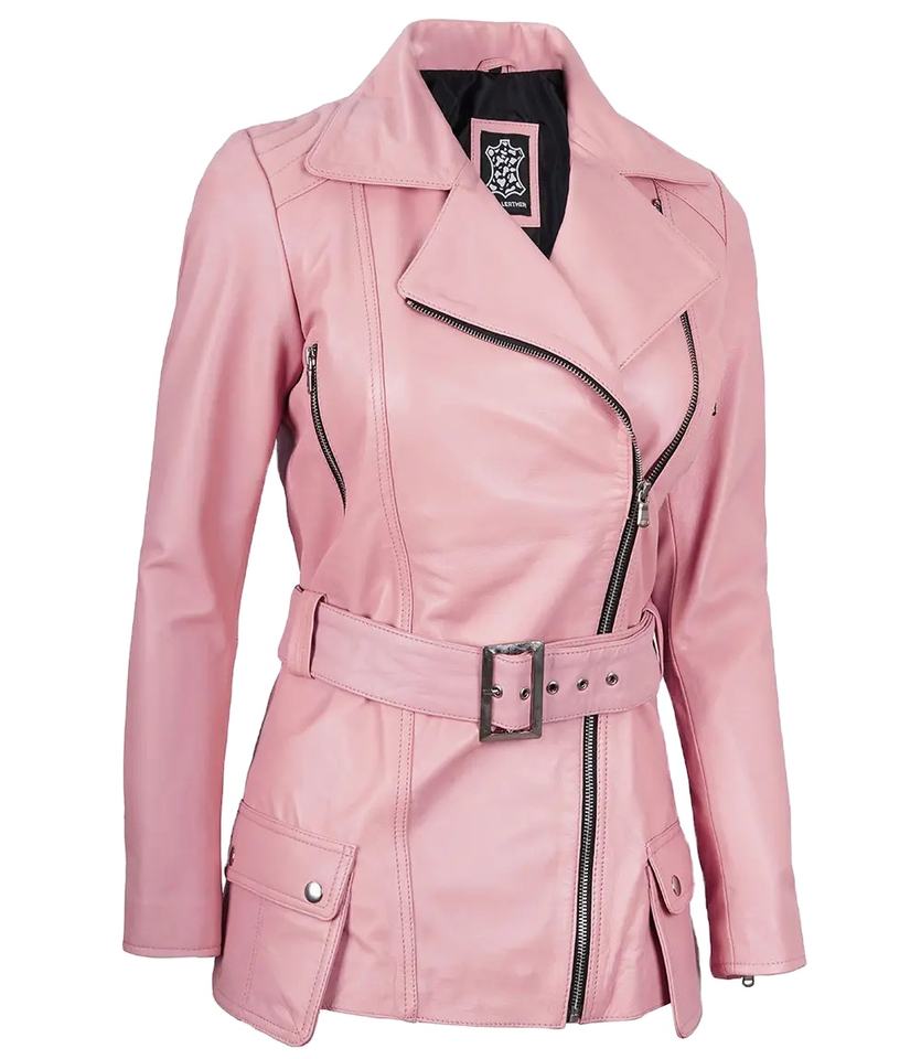เสื้อแจ็คเก็ตหนังแท้สีชมพูสำหรับผู้หญิง ตกแต่งด้วยผ้าซาติน กันลม เป็นมิตรกับสิ่งแวดล้อม คอจีน ทรงไบค์เกอร์ ซิปแบบอสมมาตร สไตล์โมโต