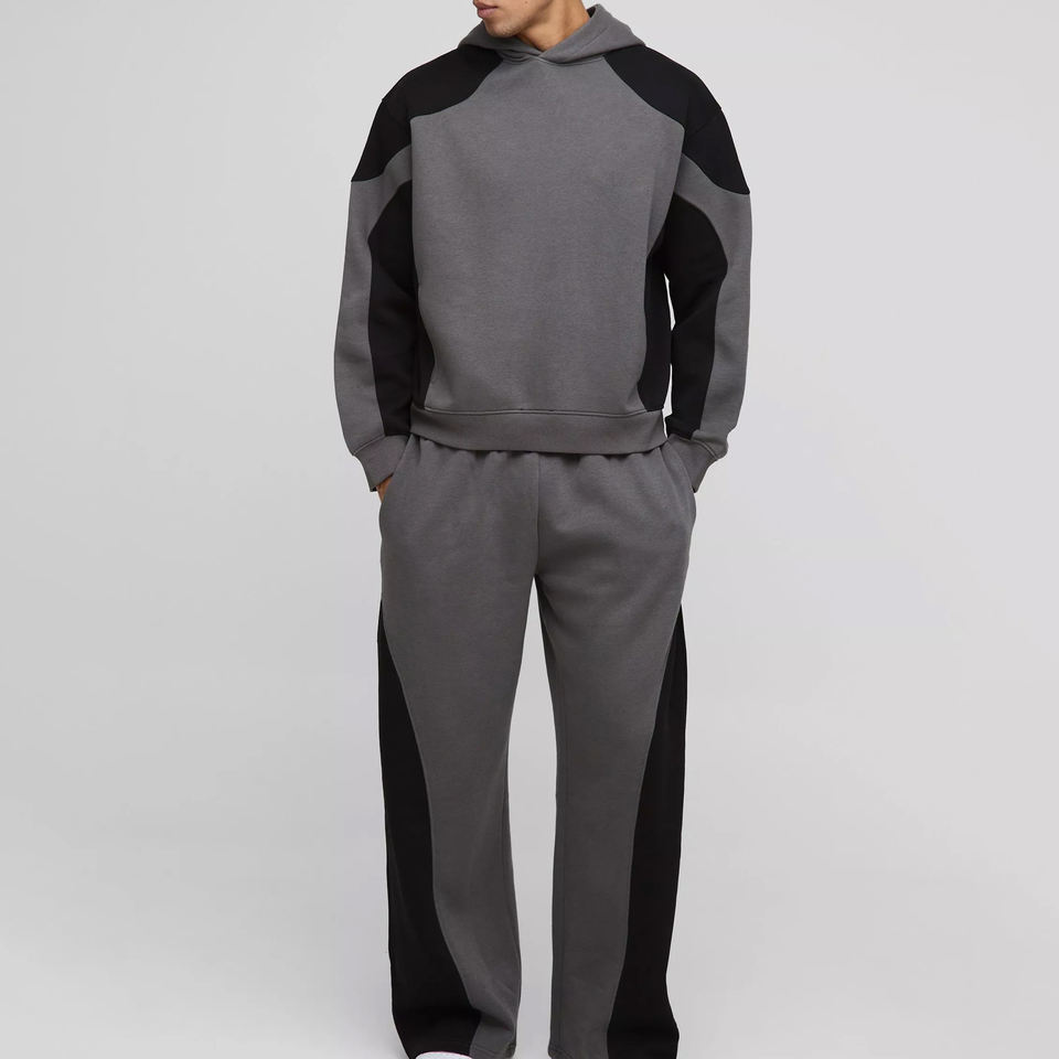 ชุดเซ็ตแทรคสูทผู้ชายแบบ 2 ชิ้น ผ้าฝ้าย 100% กางเกงขายาวทรงบานและเสื้อฮู้ด