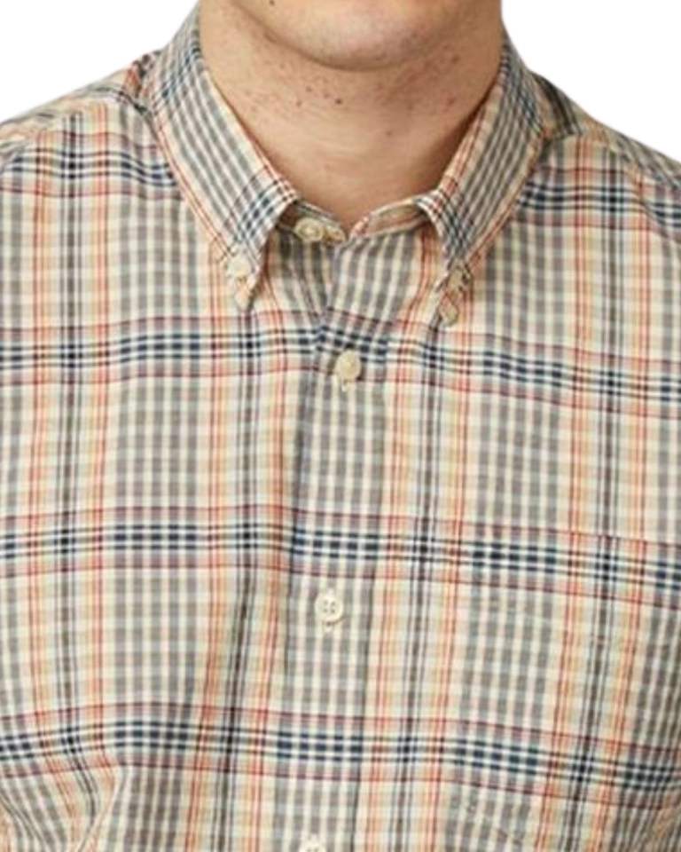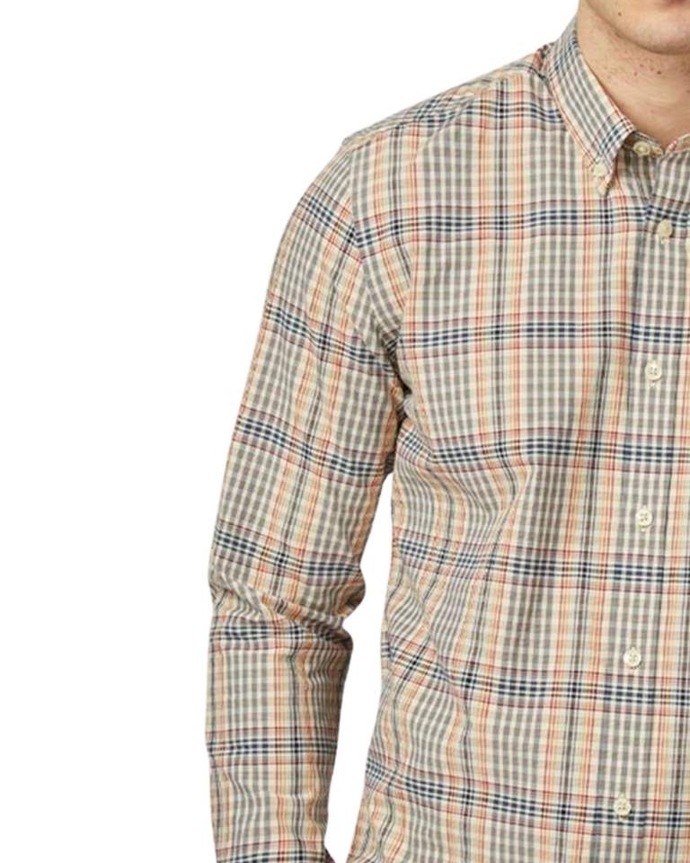 เสื้อเชิ้ตผู้ชายสีเบจ น้ำเงิน และสีสนิม ลายตารางเล็ก ผ้าฝ้าย แขนยาว ติดกระดุม แบบลำลอง สั่งผลิตได้ตามแบบ OEM โรงงานผลิตเสื้อผ้าแบบสั่งตัดพอดีตัว