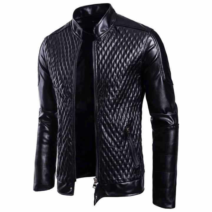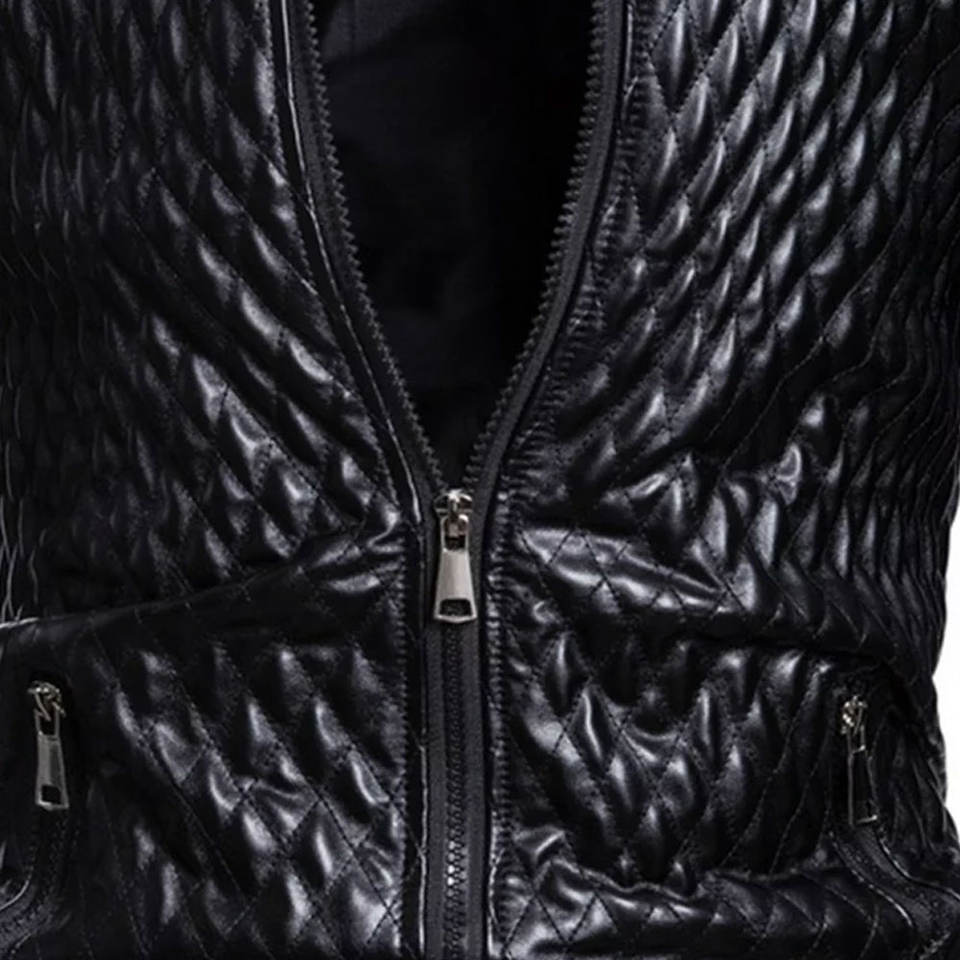 แจ็คเก็ตหนังแท้สีดำสำหรับผู้ชาย แบบเย็บลายเพชรเต็มตัว ทรงเข้ารูป หนังแกะแท้ สไตล์ไบค์เกอร์ แจ็คเก็ตมอเตอร์ไซค์ บุหนาอย่างดี เสื้อคลุมหรูหรา